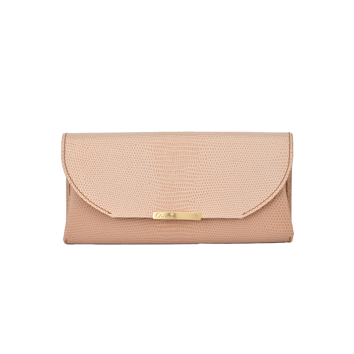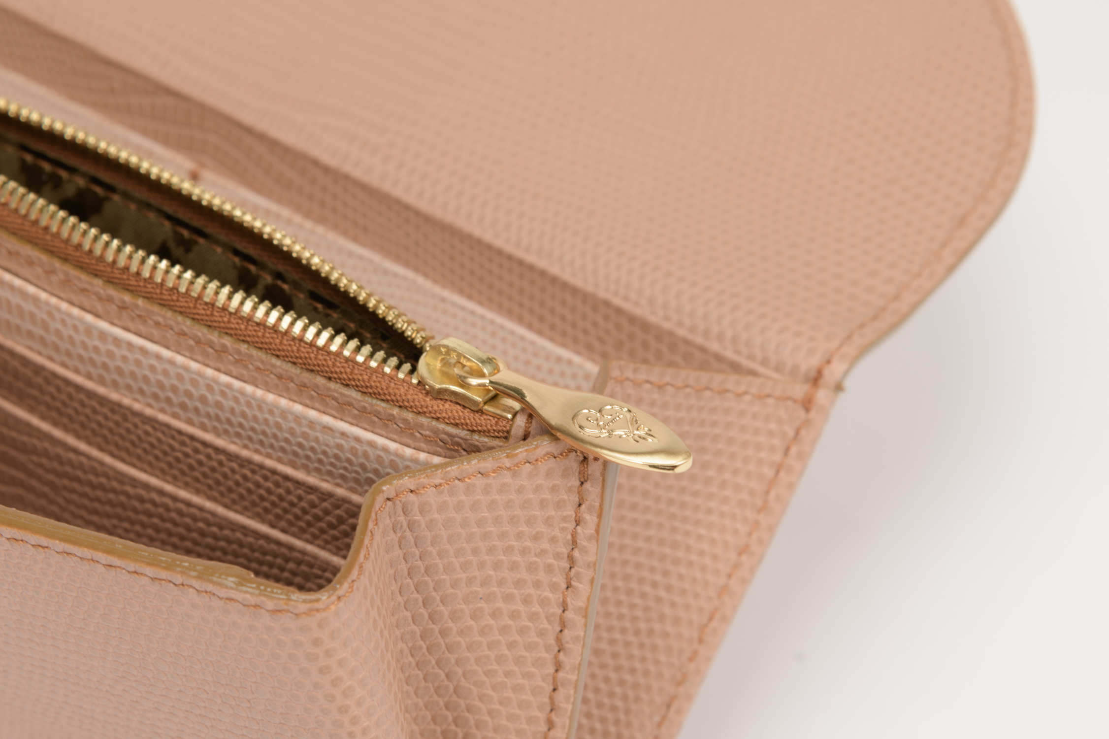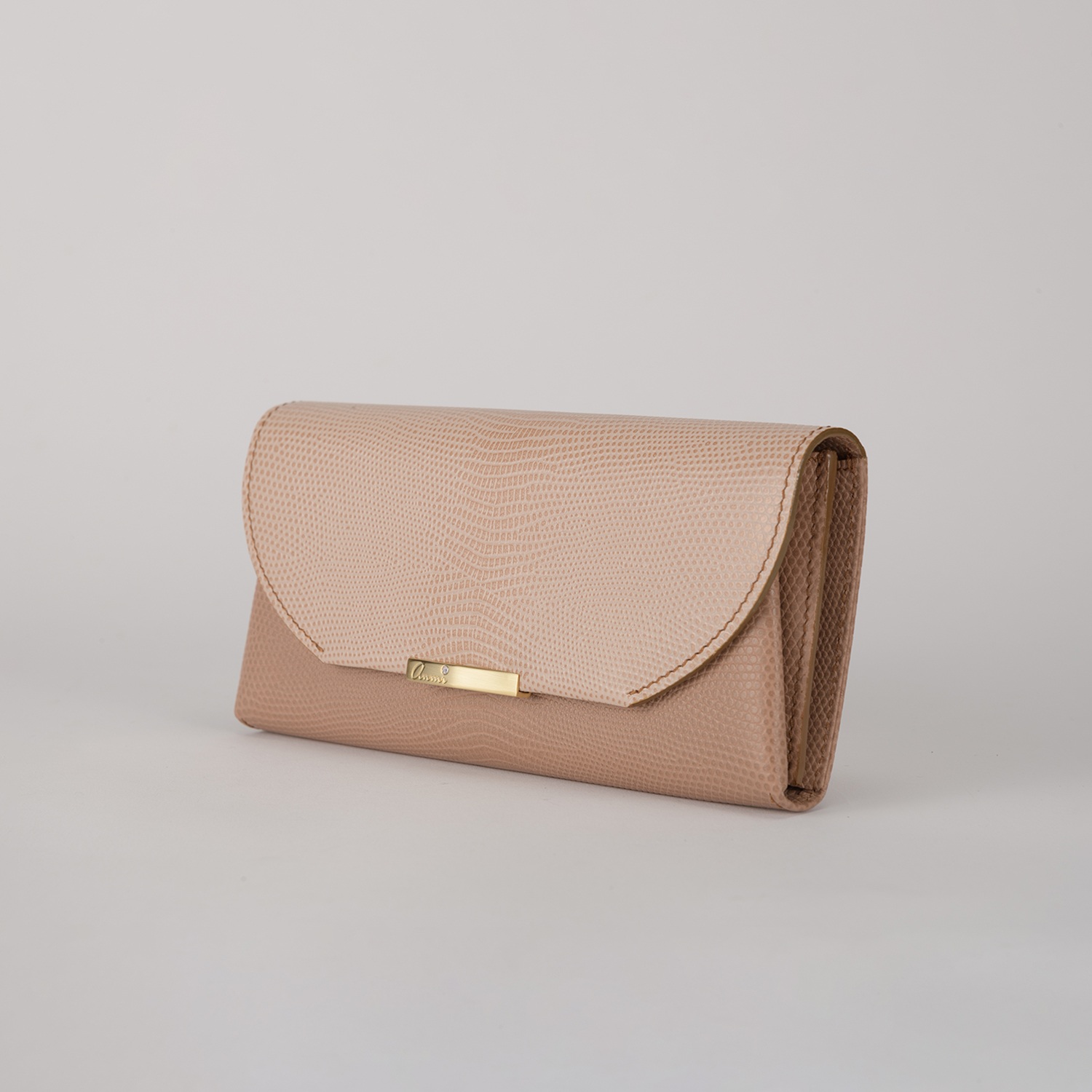 素材は、フランスの老舗革メーカーにデザイナーが色出しをリクエスト。オリジナルパステルカラー2色を贅沢に使い、グラデーションをイメージした被せ長財布。高級感のあるリザードの型押しは傷が付きにくく、上品さとお手入れしやすさが共存。内装もanmi「デュエット」シリーズ財布同様、曲線を描くインナーポケットとカードポケット装備。タイムレスに使用できる爽やかな色調で毎日のアクセントに。