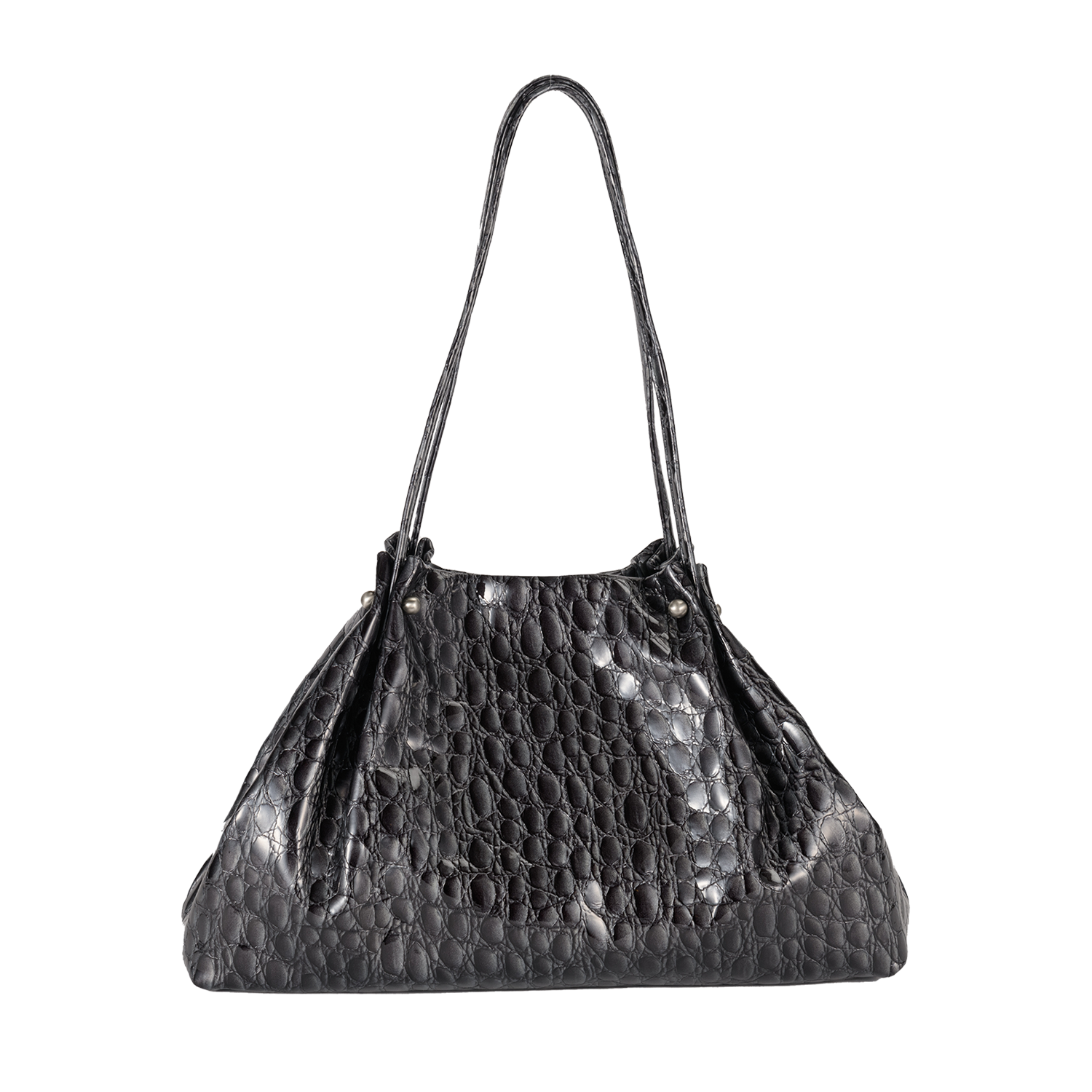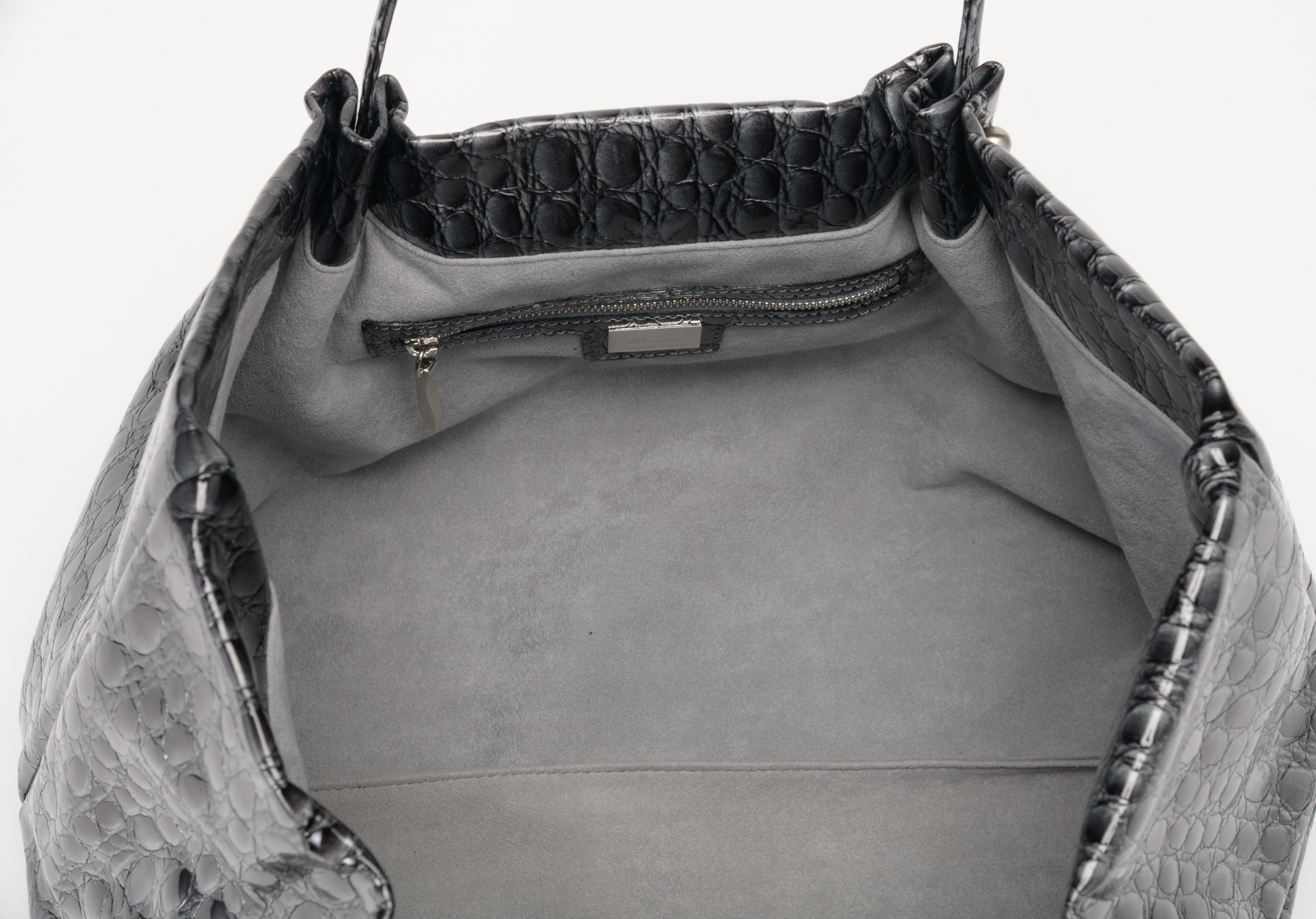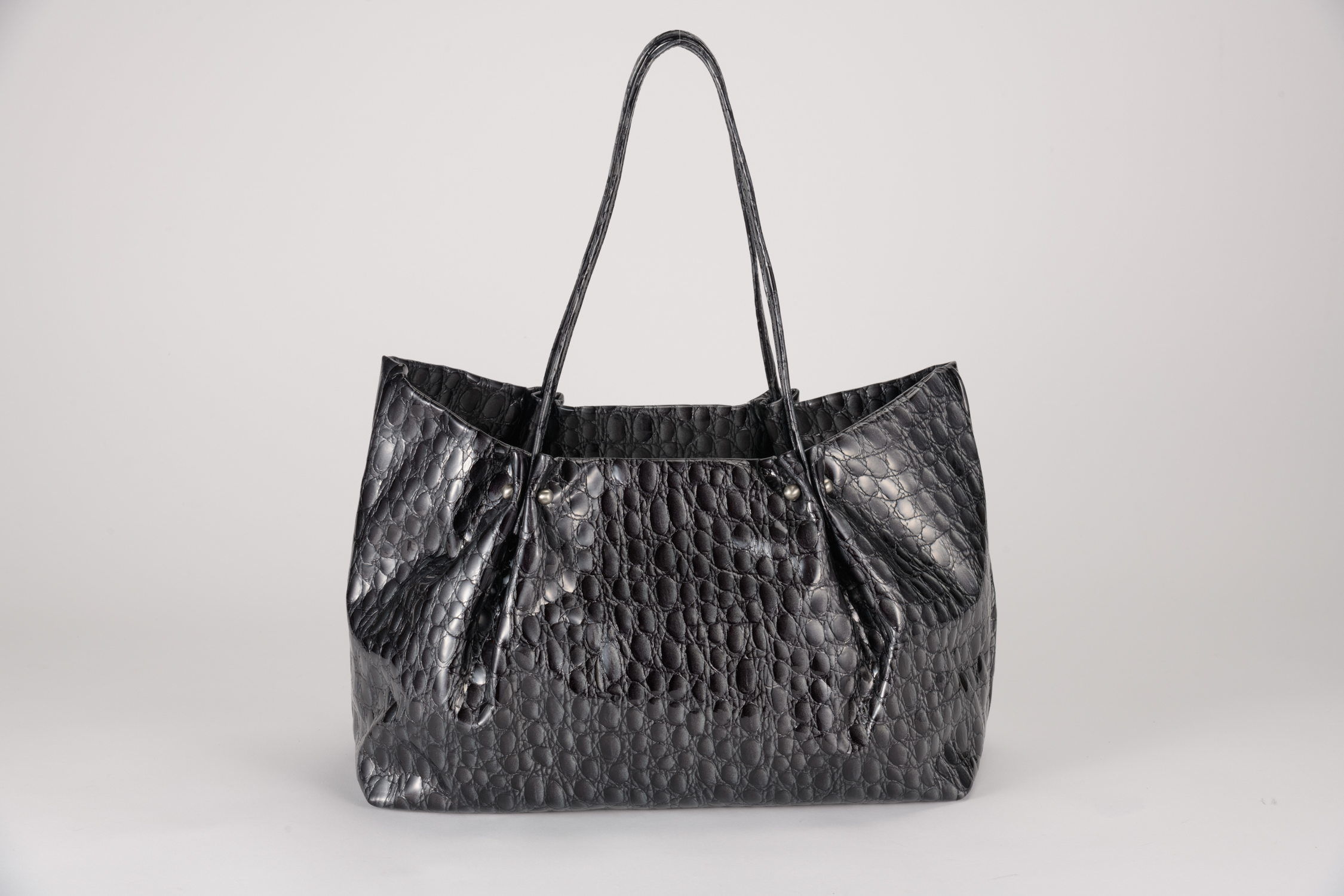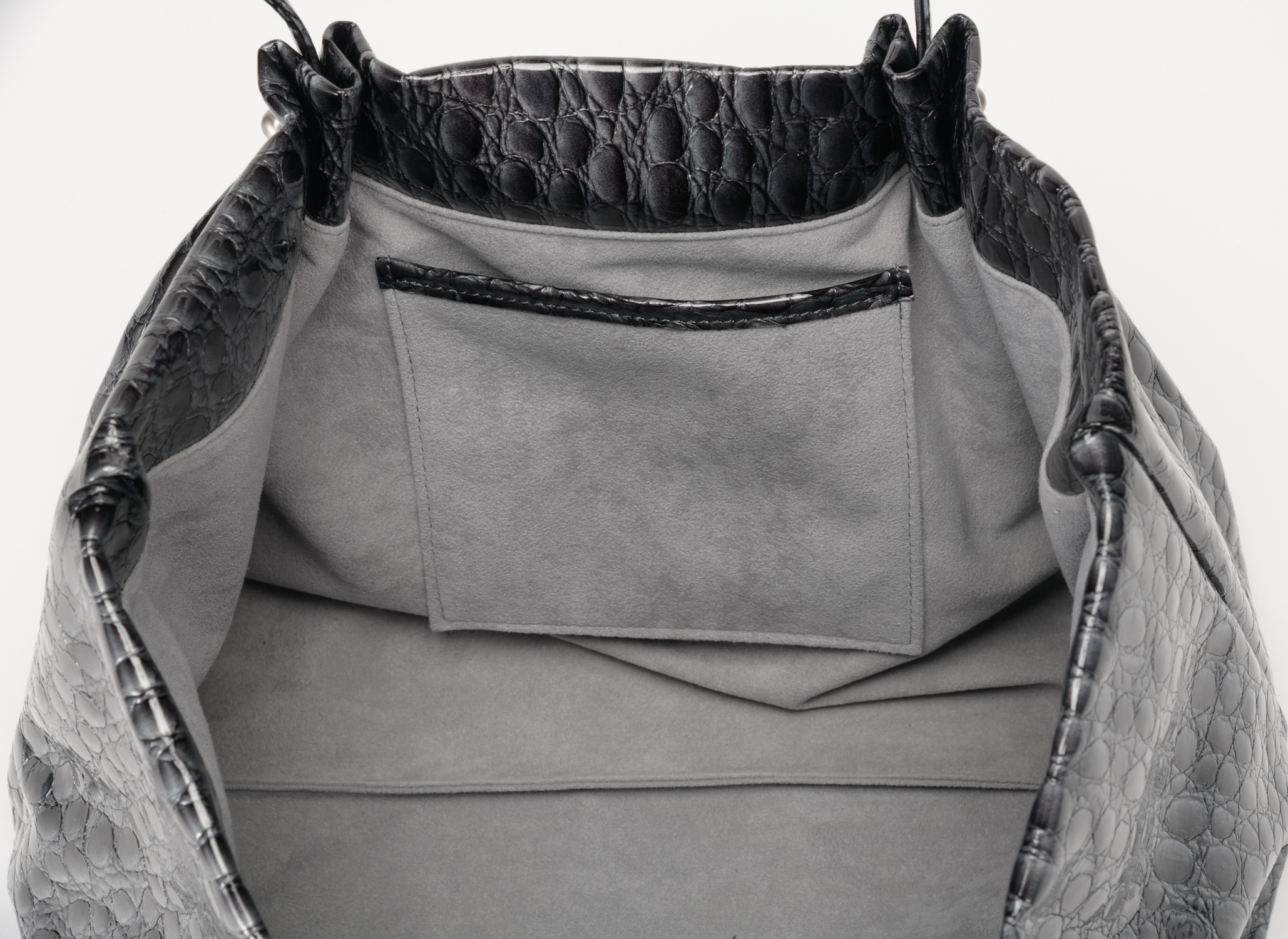 キャビアのような贅沢で深いカラー4色展開は、イタリア職人の巧みなパテント加工と希少な型押しを施したクールなイタリアンレザー。見た目にも柔らかく、Largeサイズでも590gという軽さとしなやかさを実現。ハンドル付け根のタックが綺麗にしなり、そのリュクスな素材感を際立てるデザインです。