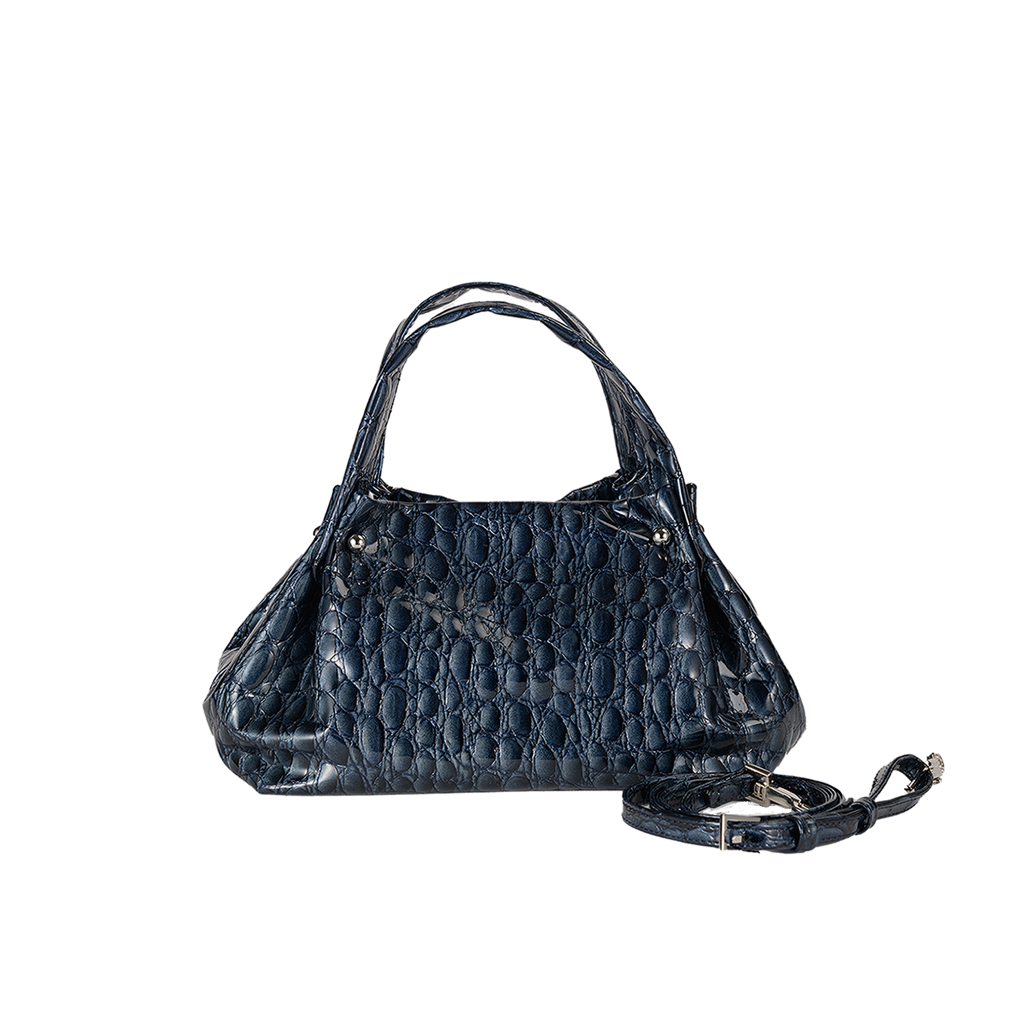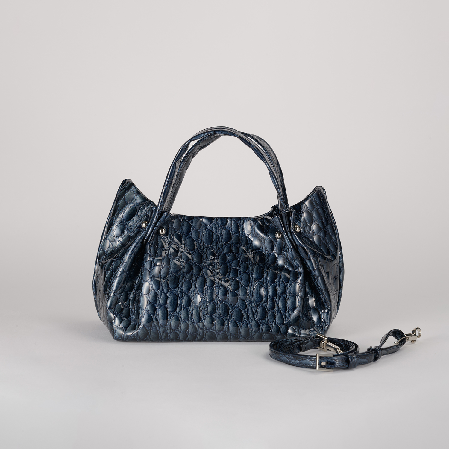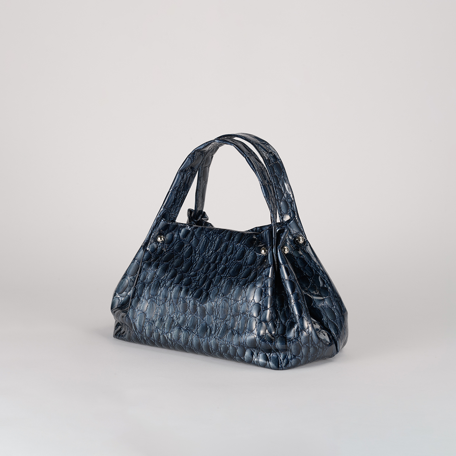 キャビアのような贅沢で深いカラー4色展開は、イタリア職人の巧みなパテント加工と希少な型押しを施したクールなイタリアンレザー。見た目にも柔らかなミニマルバッグ。ハンドル付け根のタックが綺麗にしなり、そのリュクスな素材感を際立てるデザインです。