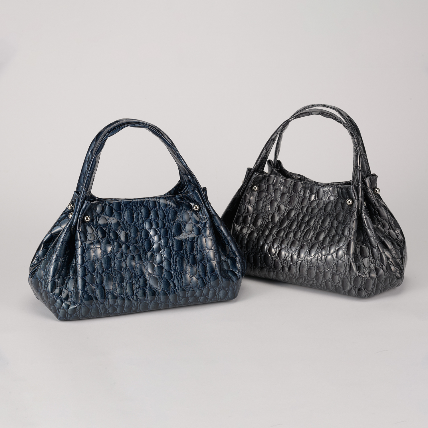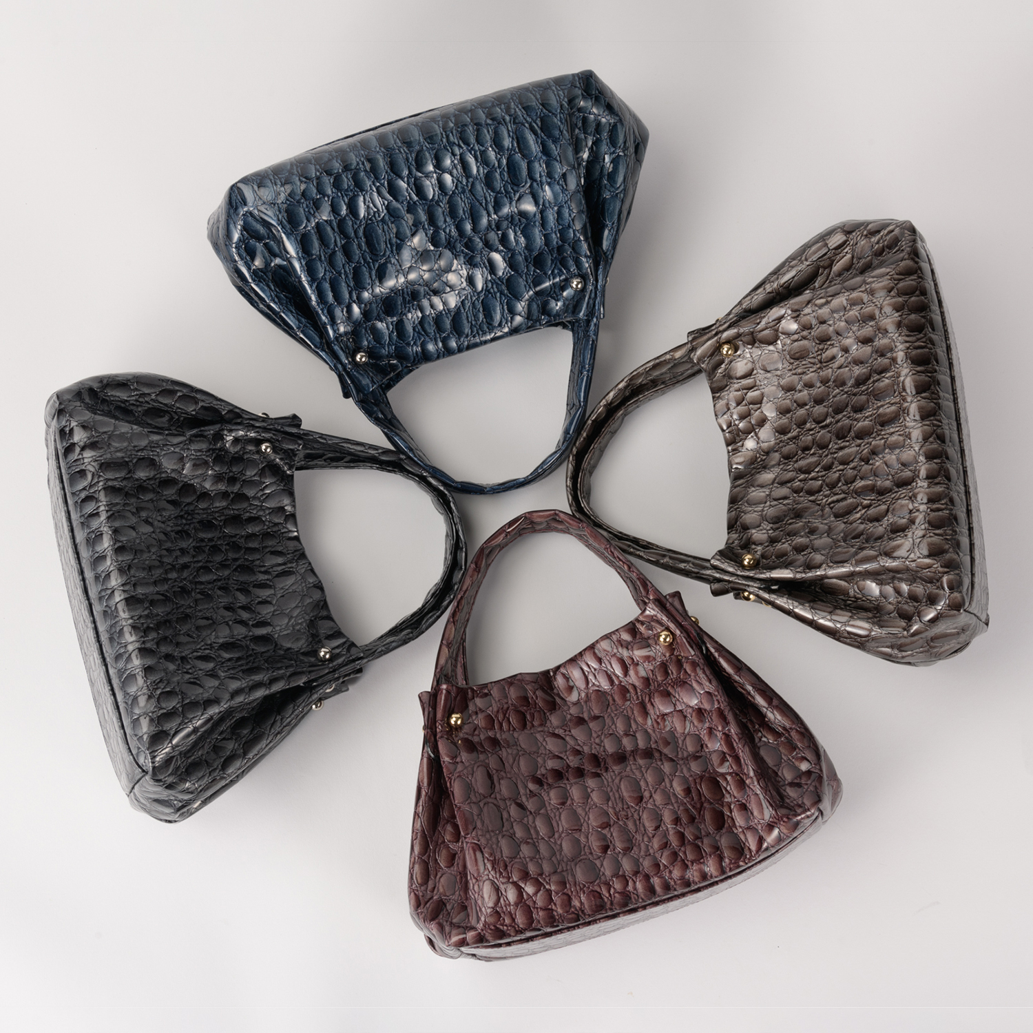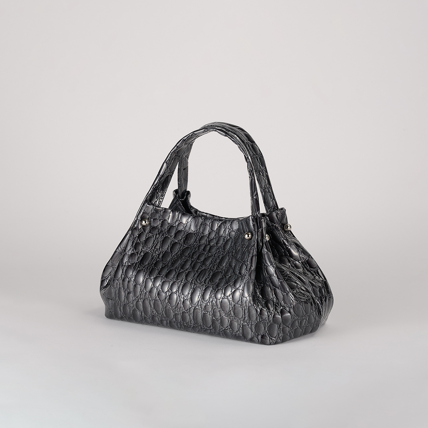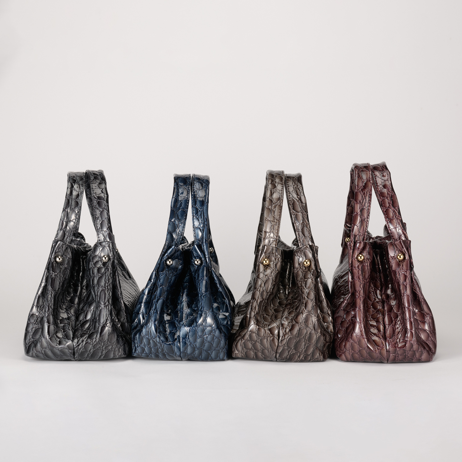 キャビアのような贅沢で深いカラー4色展開は、イタリア職人の巧みなパテント加工と希少な型押しを施したクールなイタリアンレザー。見た目にも柔らかなミニマルバッグ。ハンドル付け根のタックが綺麗にしなり、そのリュクスな素材感を際立てるデザインです。