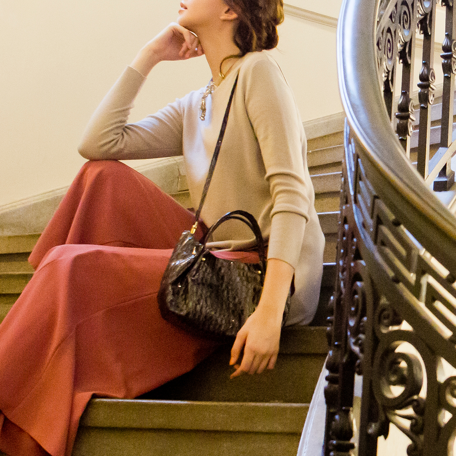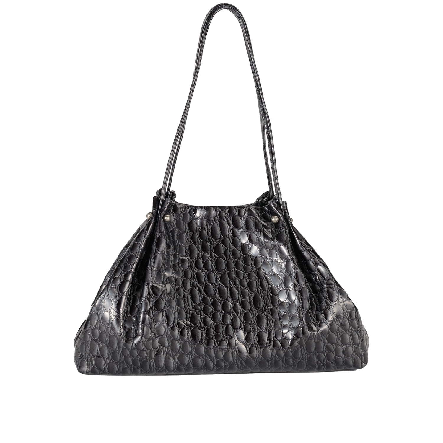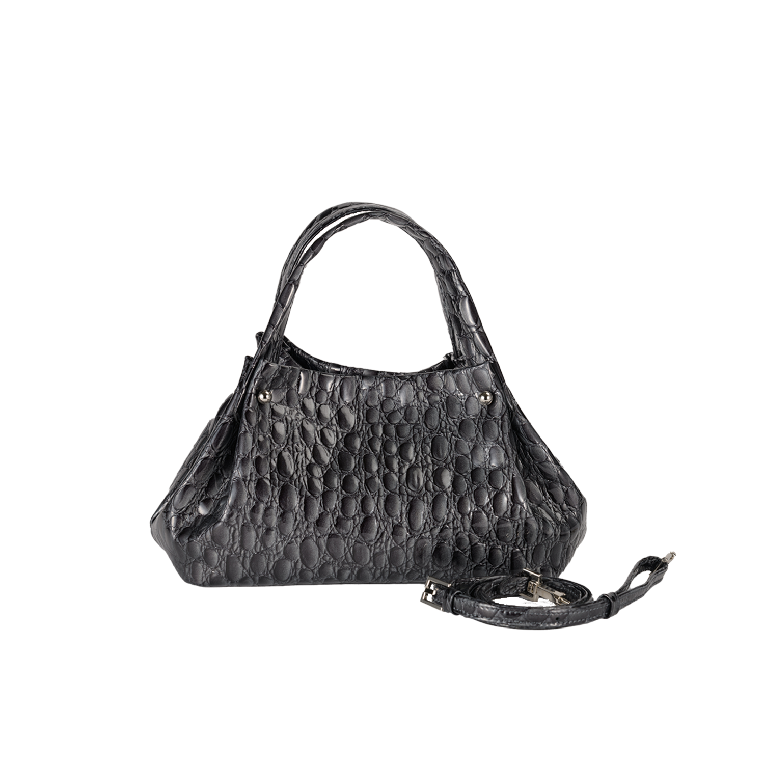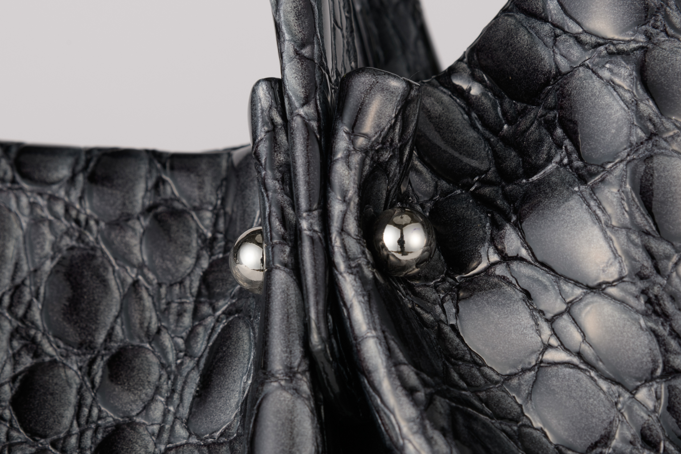 キャビアのような贅沢で深いカラー4色展開は、イタリア職人の巧みなパテント加工と希少な型押しを施したクールなイタリアンレザー。見た目にも柔らかなミニマルバッグ。ハンドル付け根のタックが綺麗にしなり、そのリュクスな素材感を際立てるデザインです。