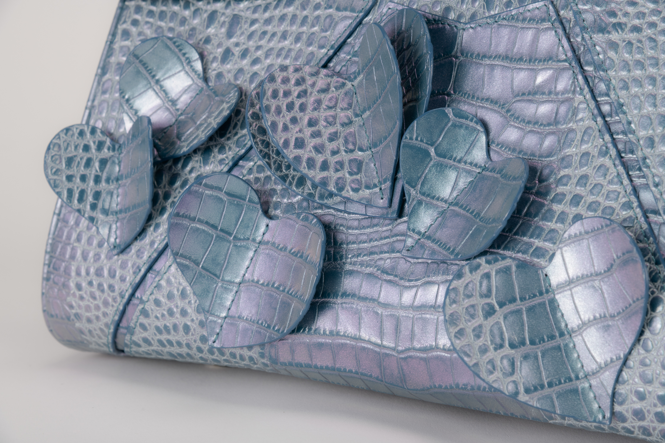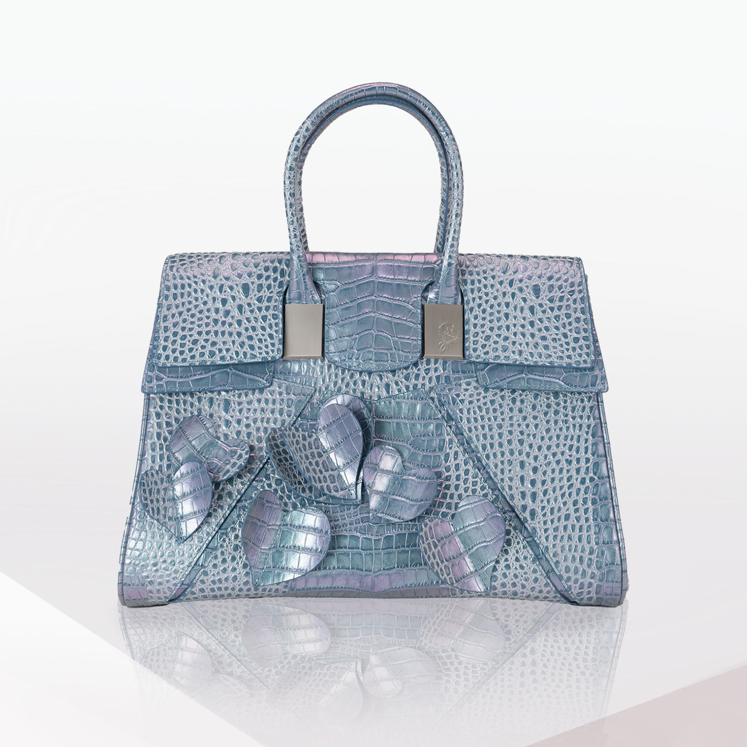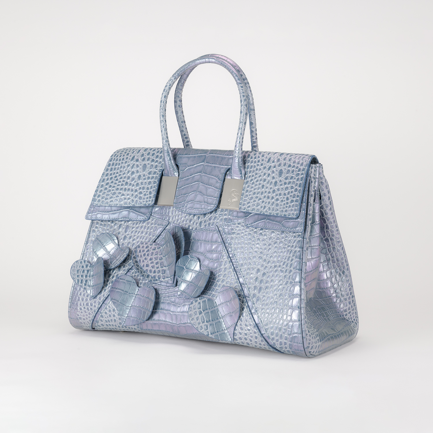 ハートがフローラルに浮き上がりダンスをしているインスピレーションでデザインされたロマンティックなバッグ。立体ハートは本体と同色革なので、さり気なくフェミニンな雰囲気を醸し出します。毎日に華を添えてくれる遊び心満載のバッグ。