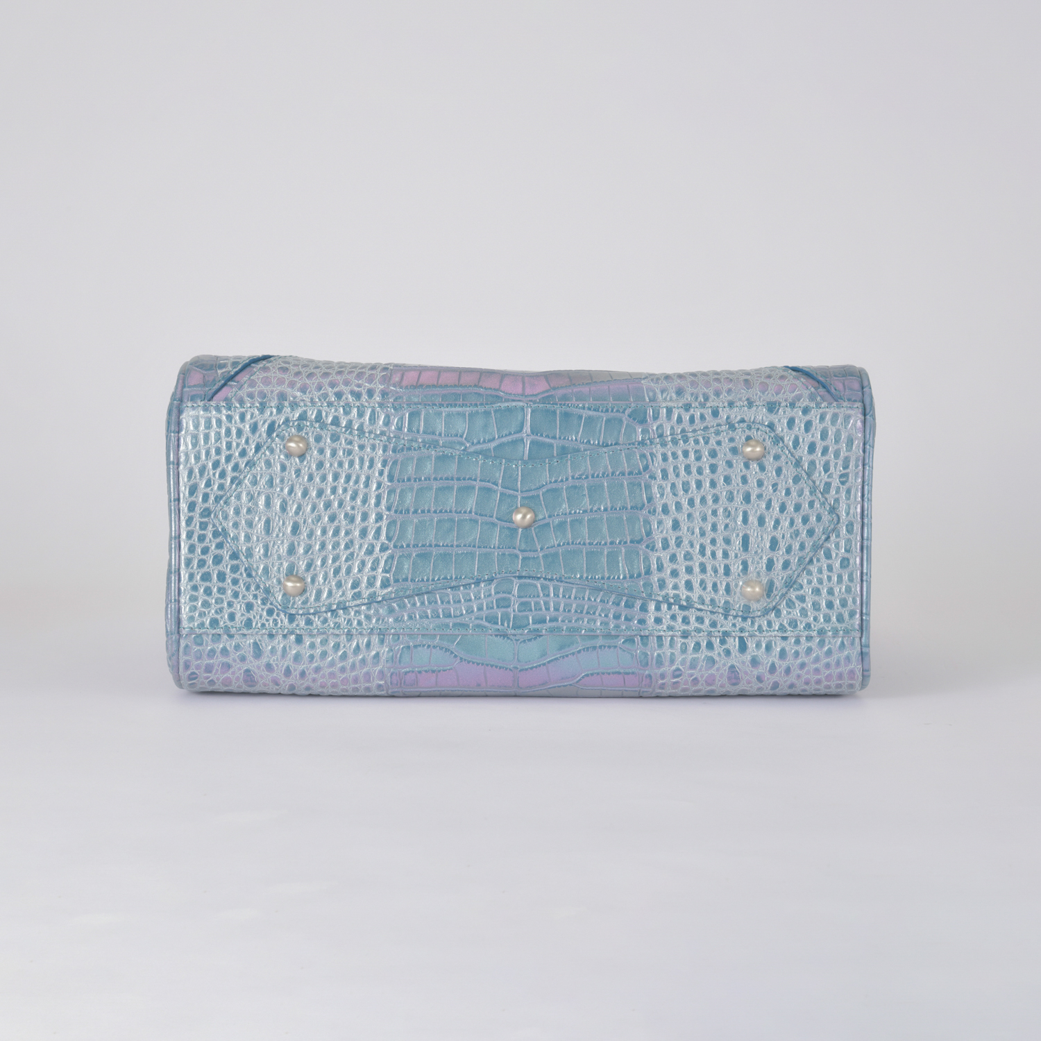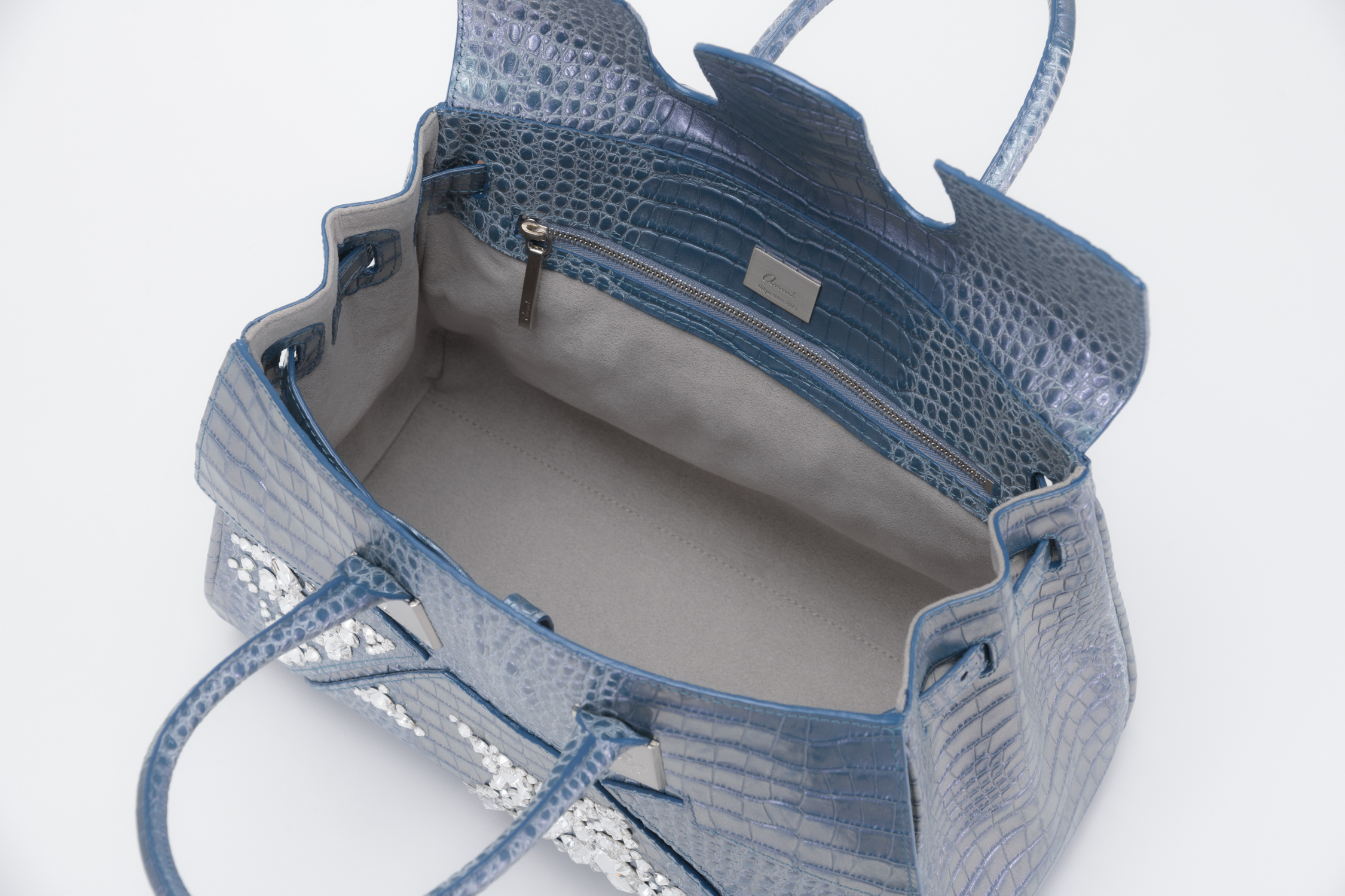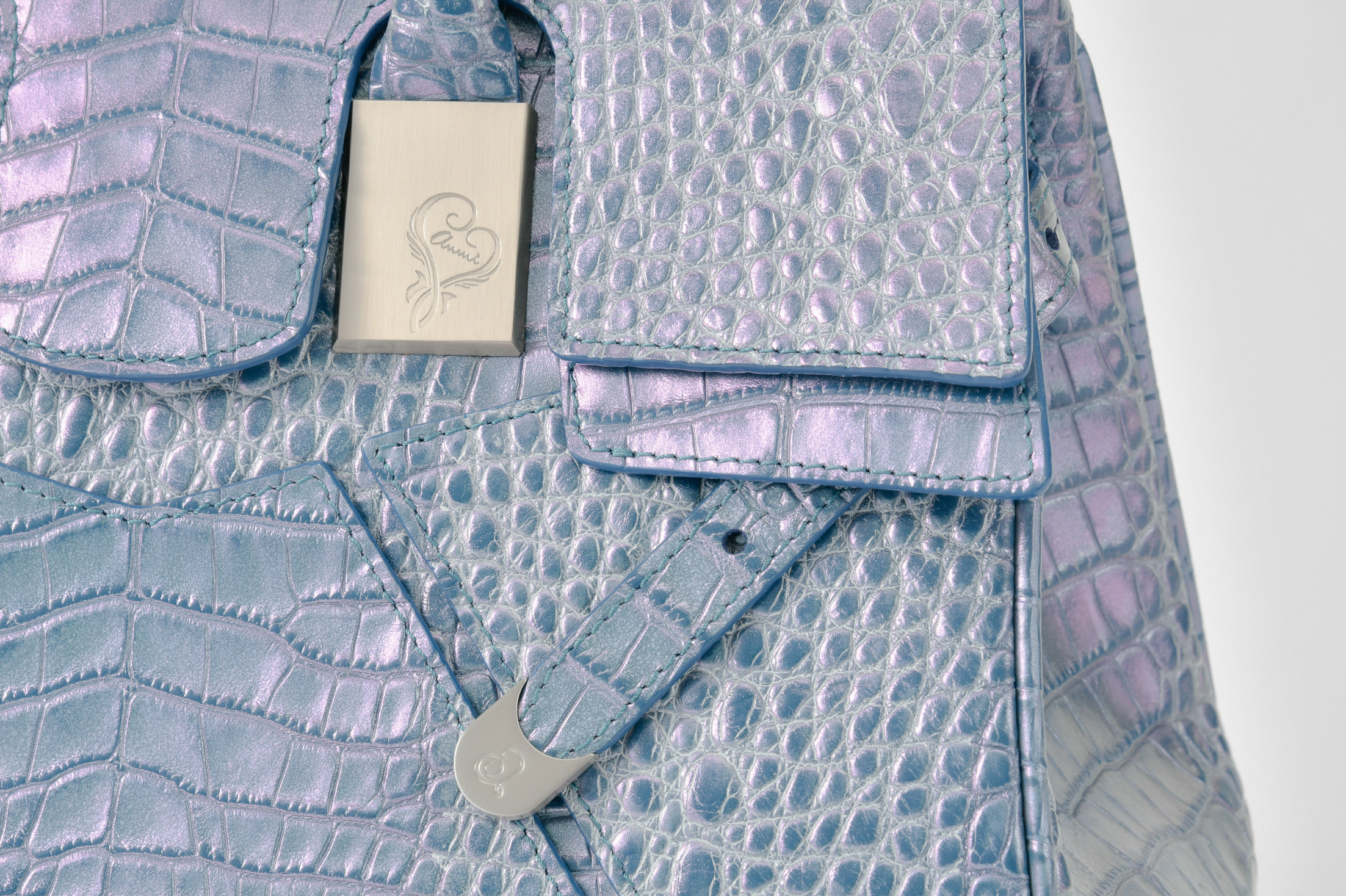 素材はデザイナー独自にイタリア、ミラノ老舗革メーカーと開発したパールソフトクロコ型押し6色で展開。イタリアの熟練された職人しかできない手仕事でReal Pearl(本真珠)を砕き、散りばめ、なめし、さらに手触りの感度をオリジナルに調整することで、日本の女性への肌馴染みの良さ、柔らかさ、軽さ、そして優しい艶、発色を実現したanmi特注イタリアンレザー。