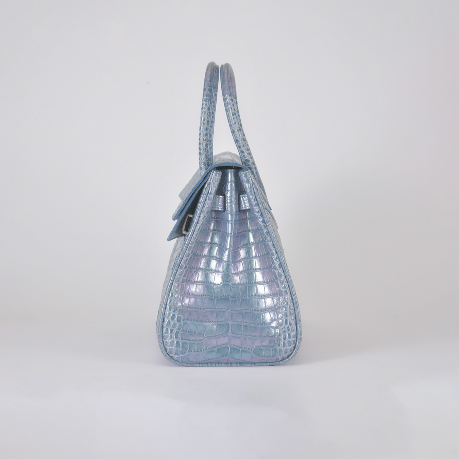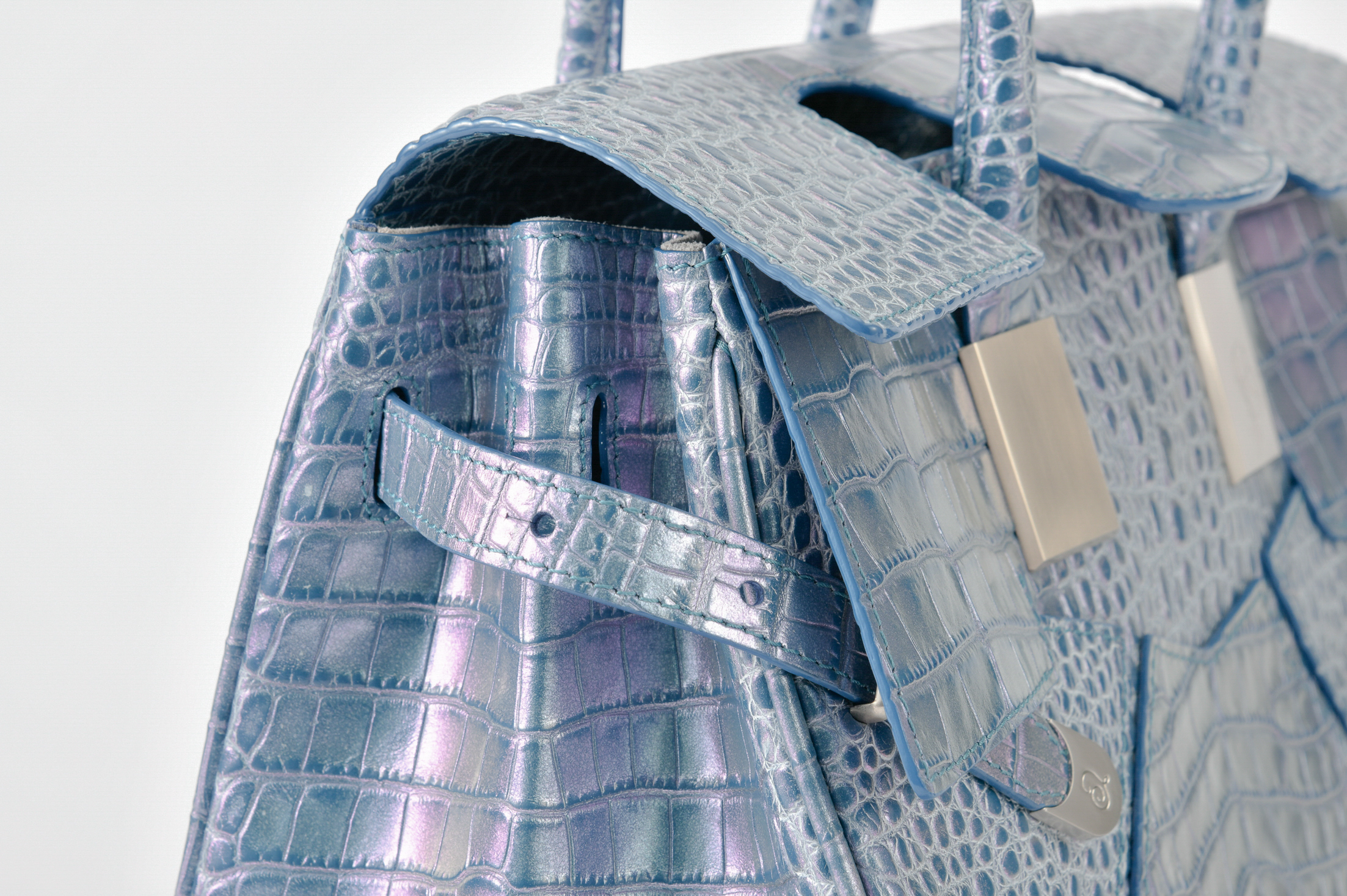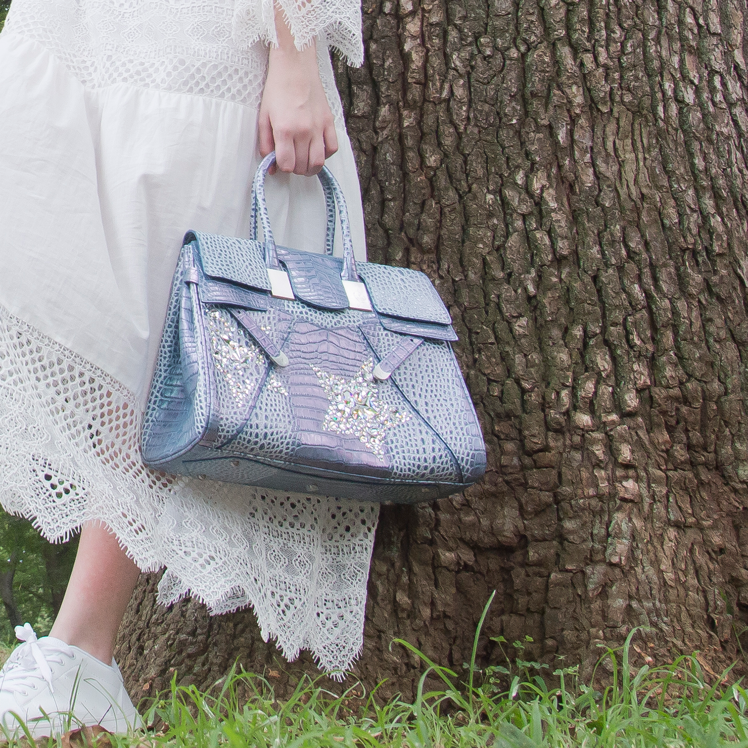 素材はデザイナー独自にイタリア、ミラノ老舗革メーカーと開発したパールソフトクロコ型押し6色で展開。イタリアの熟練された職人しかできない手仕事でReal Pearl(本真珠)を砕き、散りばめ、なめし、さらに手触りの感度をオリジナルに調整することで、日本の女性への肌馴染みの良さ、柔らかさ、軽さ、そして優しい艶、発色を実現したanmi特注イタリアンレザー。