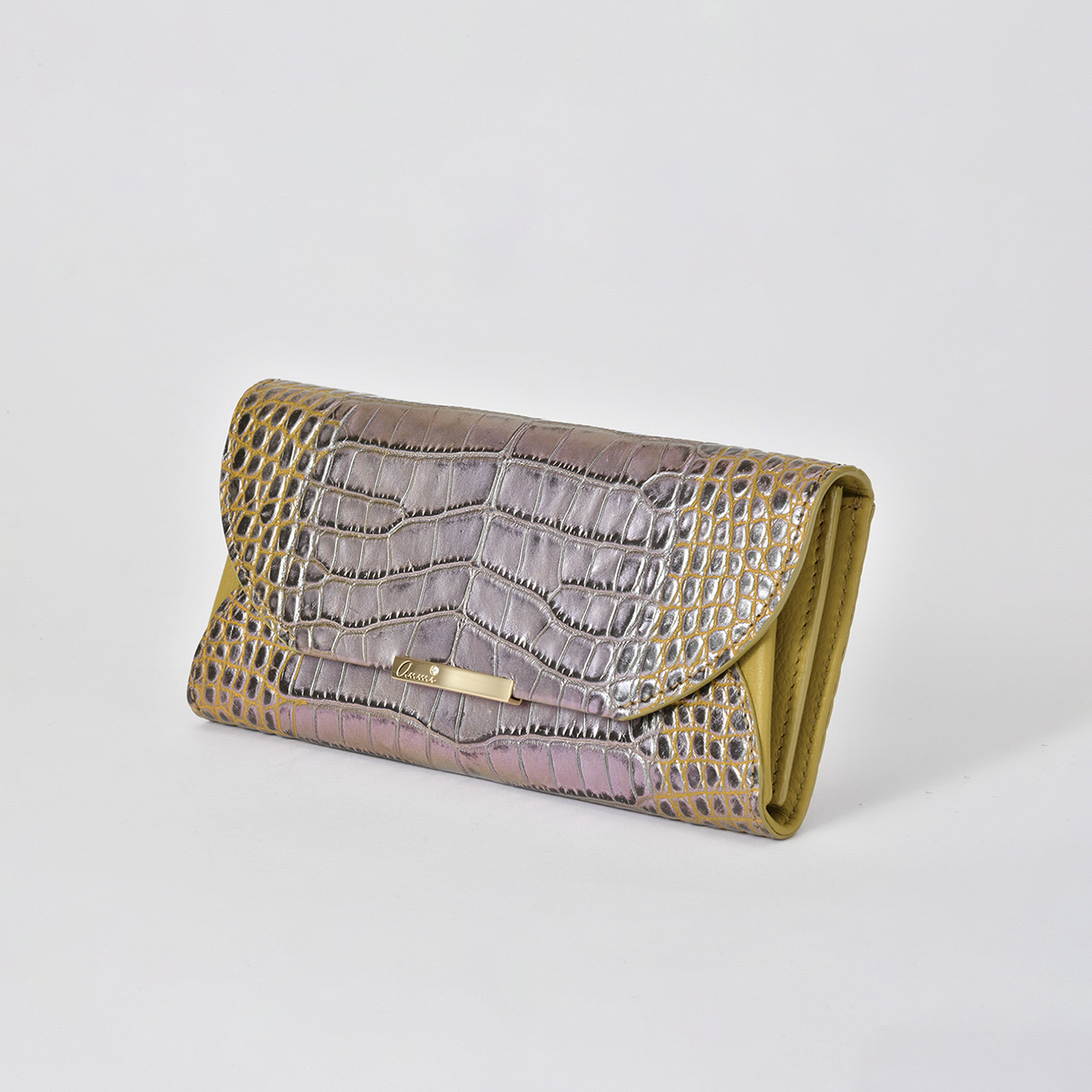 素材はデザイナー独自にイタリア、ミラノ老舗革メーカーと開発したパールソフトクロコ型押し6色で展開。イタリアの熟練された職人しかできない手仕事でReal Pearl(本真珠)を砕き、散りばめ、なめし、さらに手触りの感度をオリジナルに調整することで、日本の女性への肌馴染みの良さ、柔らかさ、軽さ、そして優しい艶、発色を実現したanmi特注イタリアンレザー。