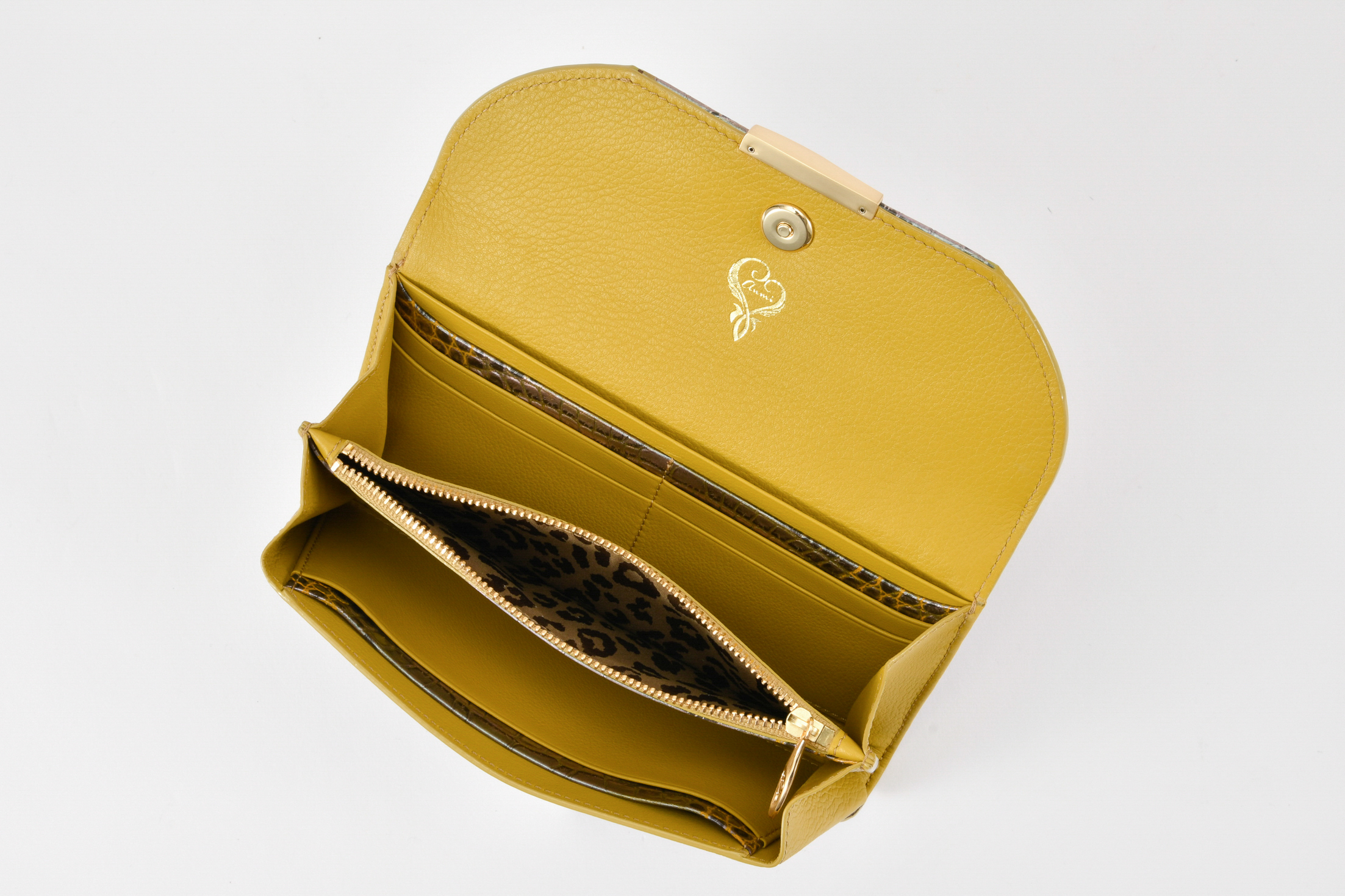 内装は贅沢な手触り優しいフレンチレザーとファスナー付きのコインポケット裏地は艶めくレオパードパターンサテン地を使用。曲線を描いた複数のカードポケットも必要ミニマム数に完備され、開く度に美しく豊かな視覚感度の高い、長く使えるデザインが魅力です。