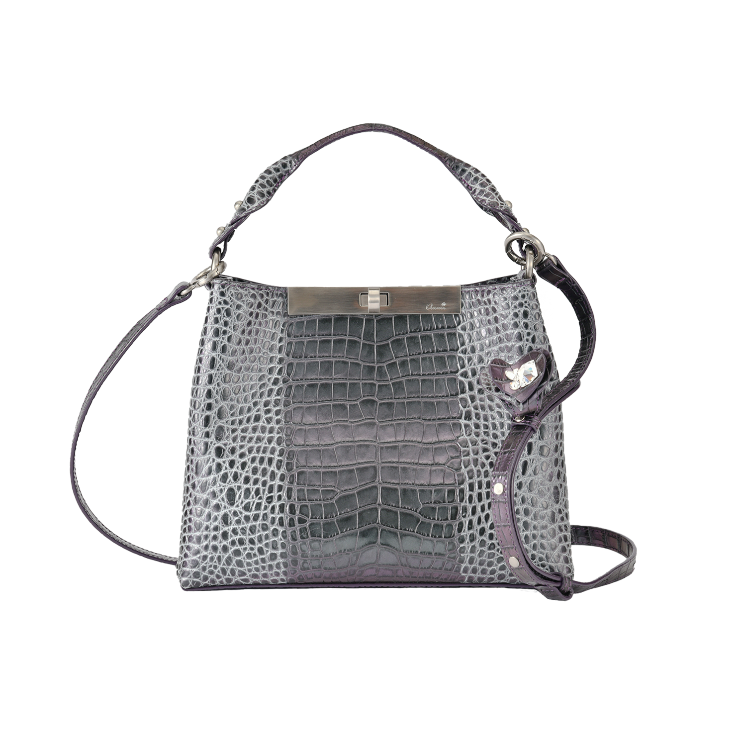 素材はデザイナー独自にイタリア、ミラノ老舗革メーカーと開発したパールソフトクロコ型押し6色で展開。イタリアの熟練された職人しかできない手仕事でReal Pearl(本真珠)を砕き、散りばめ、なめし、さらに手触りの感度をオリジナルに調整することで、日本の女性への肌馴染みの良さ、柔らかさ、軽さ、そして優しい艶、発色を実現したanmi特注イタリアンレザー。