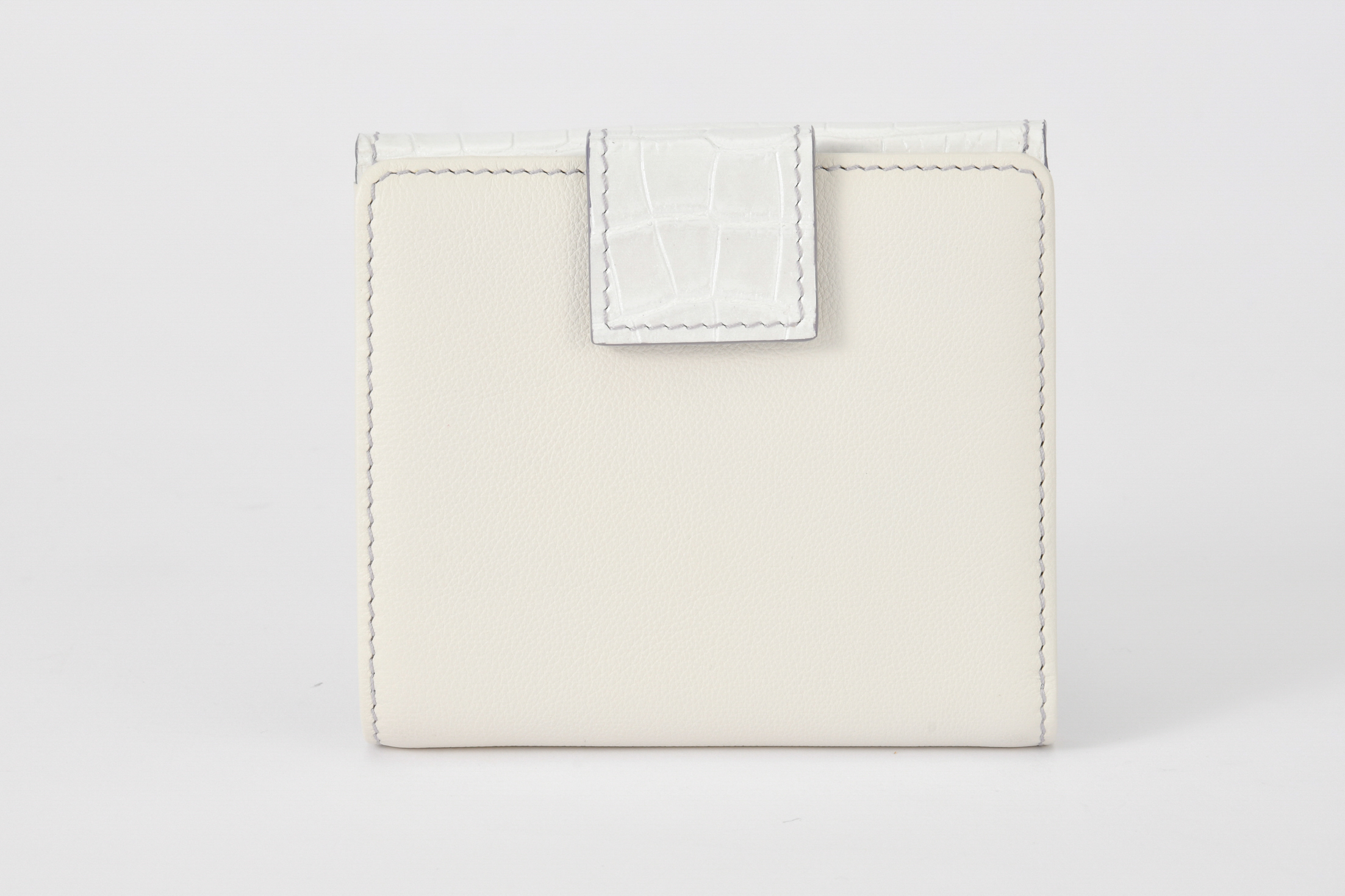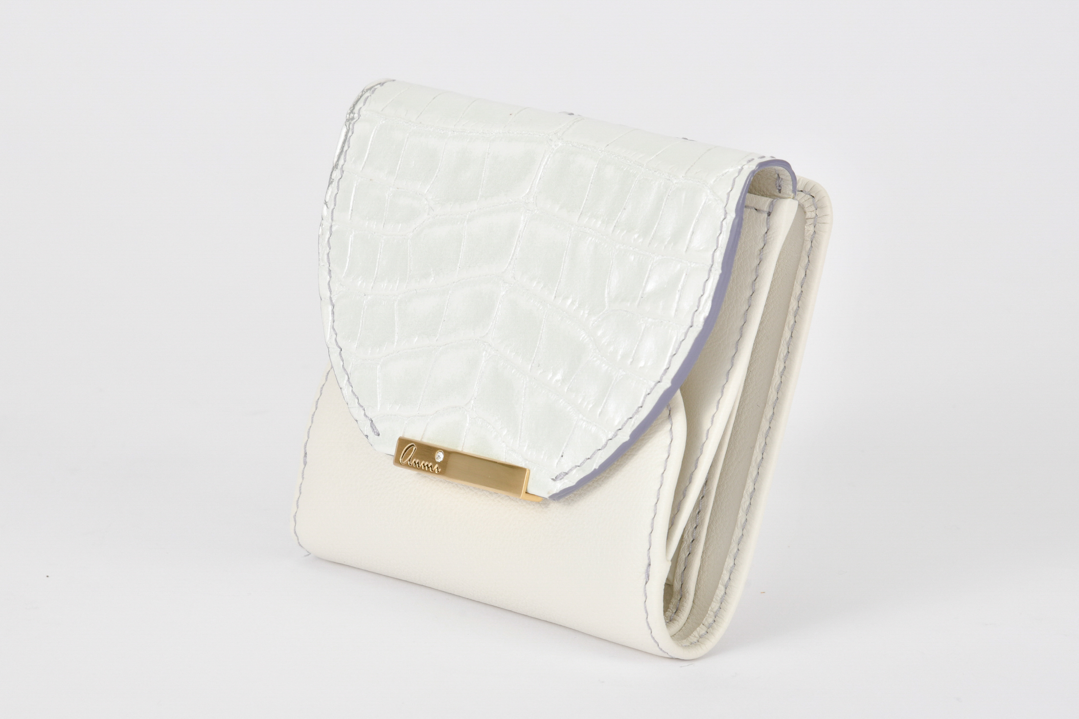 「デュエット」シリーズよりフェミニンで優雅なスリムさ誇るanmi革小物、コンパクトな二つ折り財布。メルドとは融合、ブレンドと言う意味。anmi特注パールレザーと相性の良い異素材コンビネーションで色をさらに楽しく豊かにしなやかさを極めた逸品。