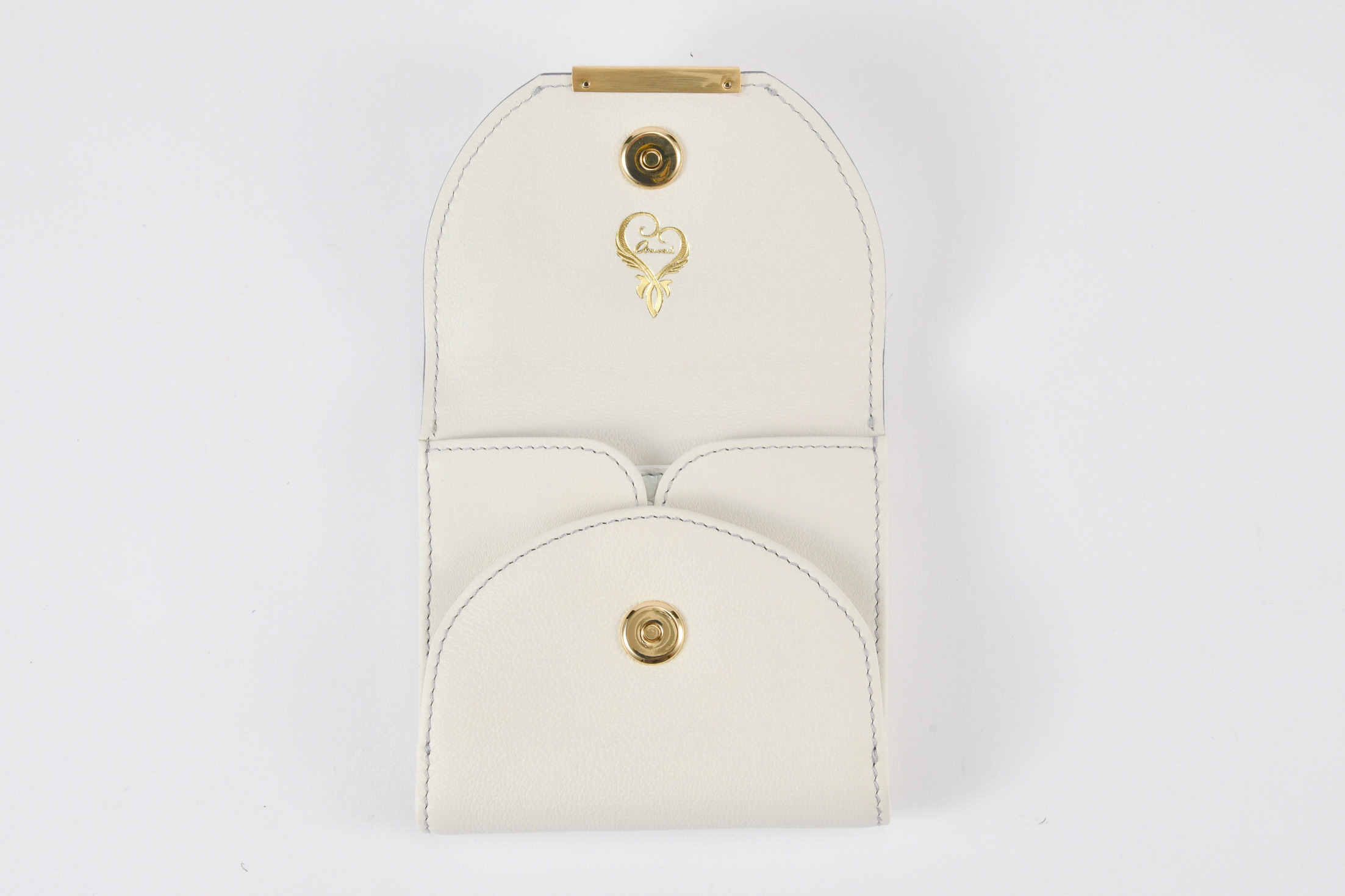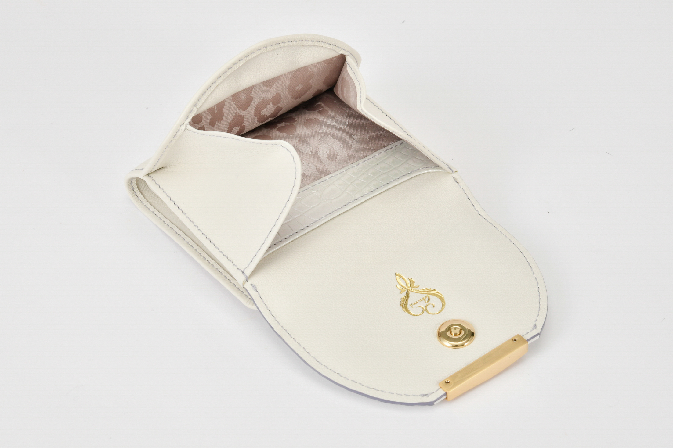 内装は贅沢な手触り優しいフレンチレザーとファスナー付きのコインポケット裏地は艶めくレオパードパターンサテン地を使用。曲線を描いた複数のカードポケットも必要ミニマム数に完備され、開く度に美しく豊かな視覚感度の高い、長く使えるデザインが魅力です。