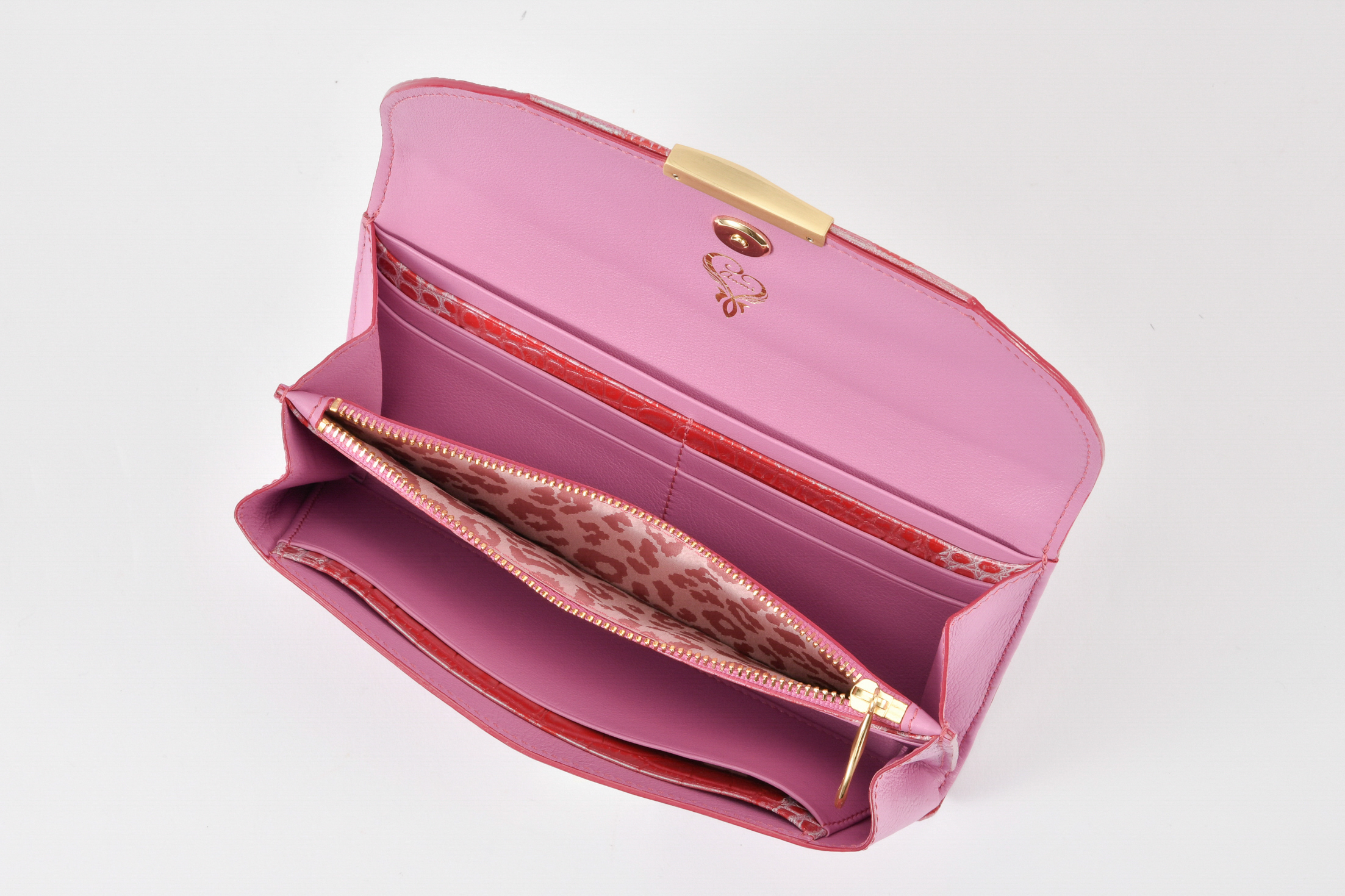内装は贅沢な手触り優しいフレンチレザーとファスナー付きのコインポケット裏地は艶めくレオパードパターンサテン地を使用。曲線を描いた複数のカードポケットも必要ミニマム数に完備され、開く度に美しく豊かな視覚感度の高い、長く使えるデザインが魅力です。