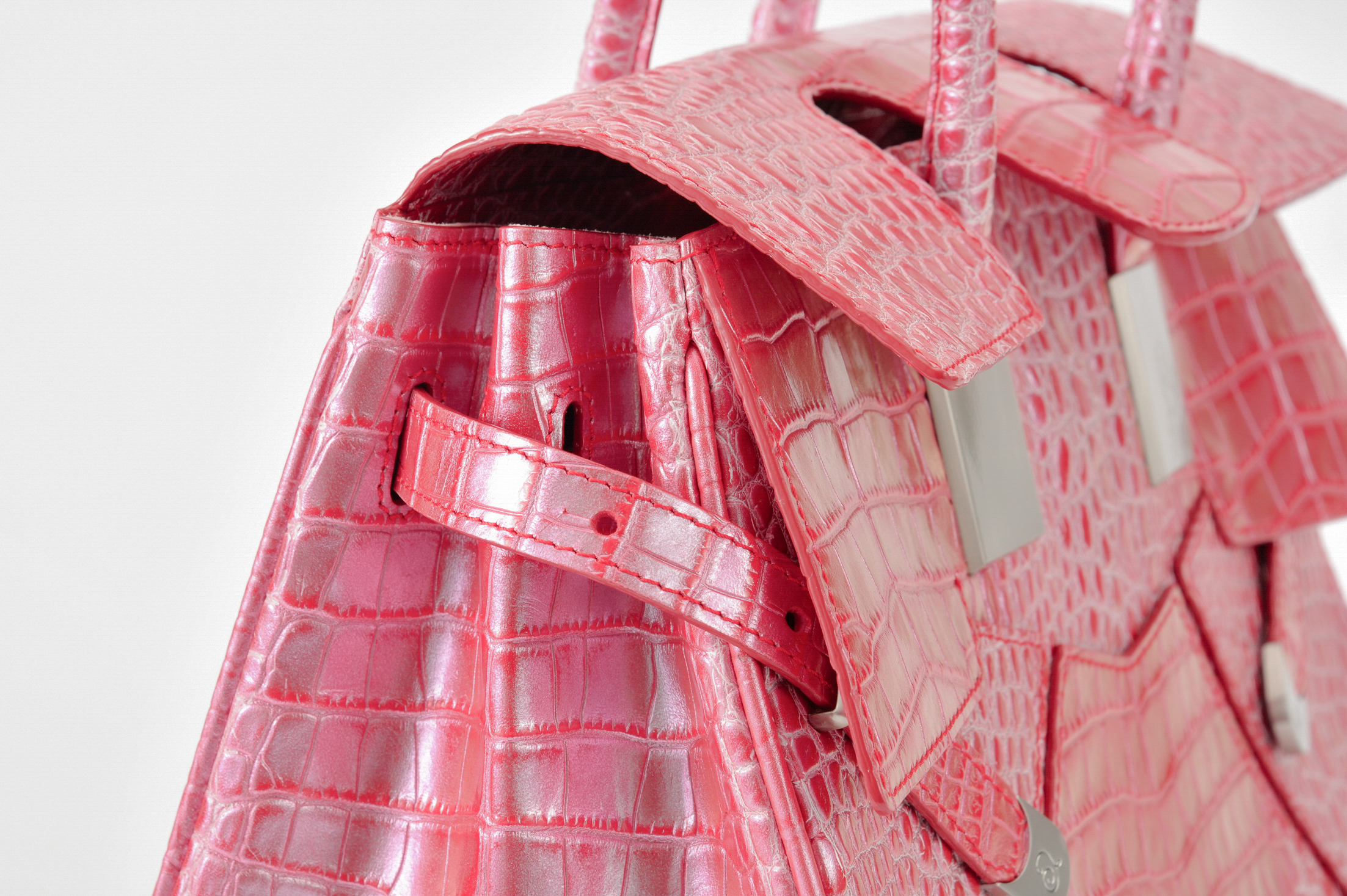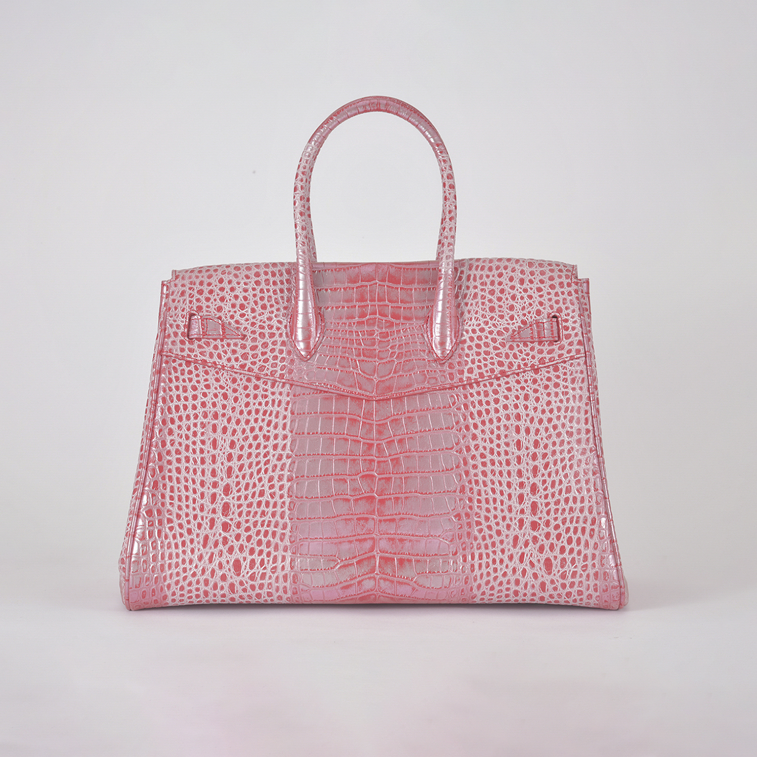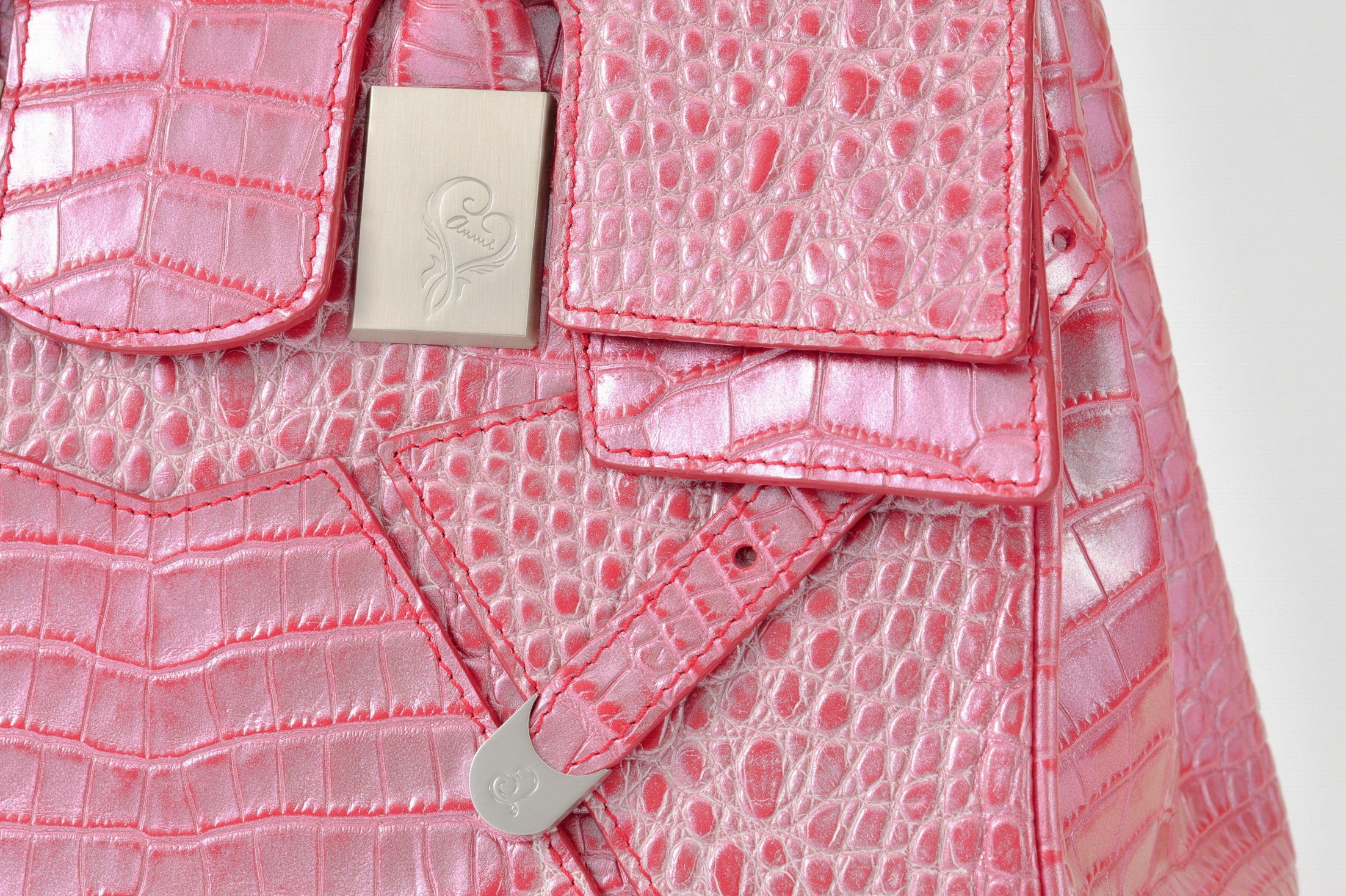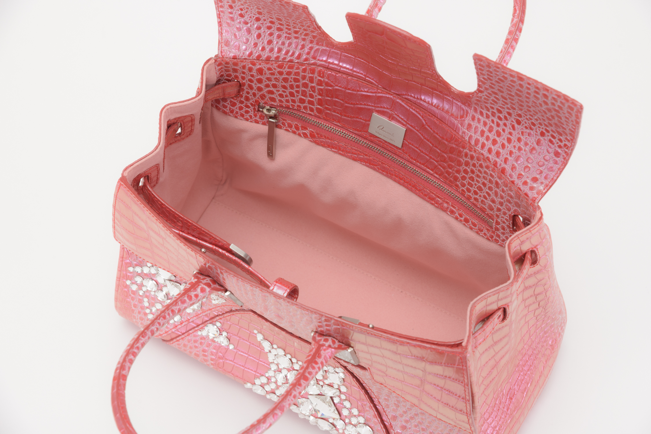 素材はデザイナー独自にイタリア、ミラノ老舗革メーカーと開発したパールソフトクロコ型押し6色で展開。イタリアの熟練された職人しかできない手仕事でReal Pearl(本真珠)を砕き、散りばめ、なめし、さらに手触りの感度をオリジナルに調整することで、日本の女性への肌馴染みの良さ、柔らかさ、軽さ、そして優しい艶、発色を実現したanmi特注イタリアンレザー。