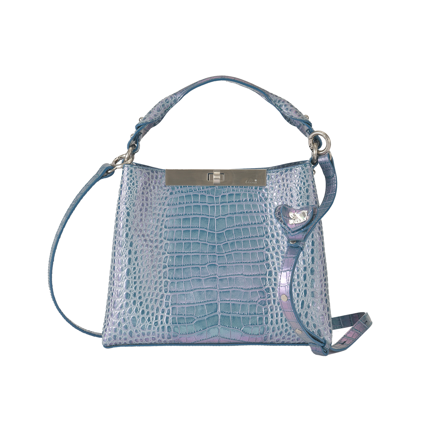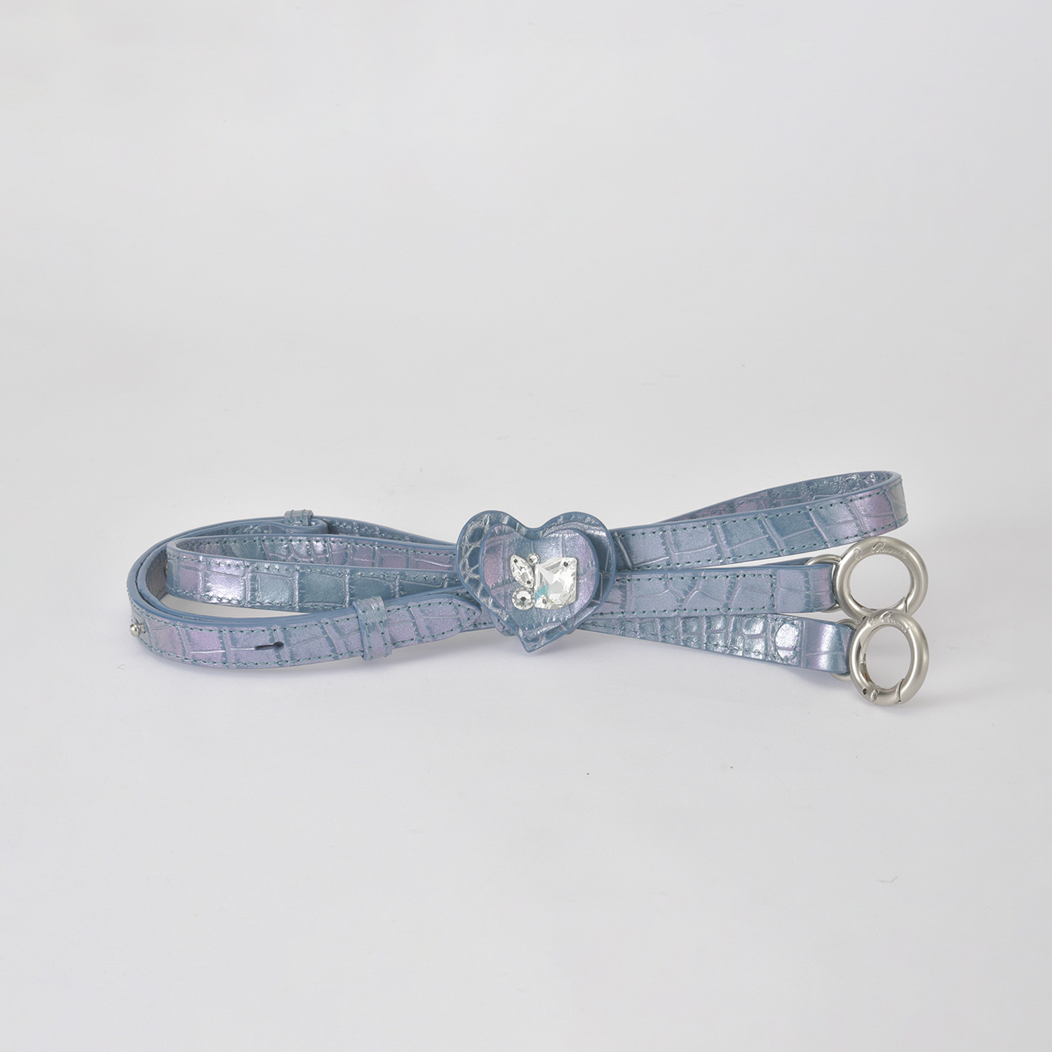 ジュエルのように大粒のスワロフスキーを施し、このクリップを使うことで自由なアレンジができるようデザインされています。例えば、ベルトを好きな形に束ねてクリップで留め、バッグ正面にぶら下げたり、ショルダーベルトにこのクリップを留めて、まるでハートの蝶が肩に乗っているように飾ったりと、自分なりのアクセントとしてデザインの変化をお楽しみ頂けます。