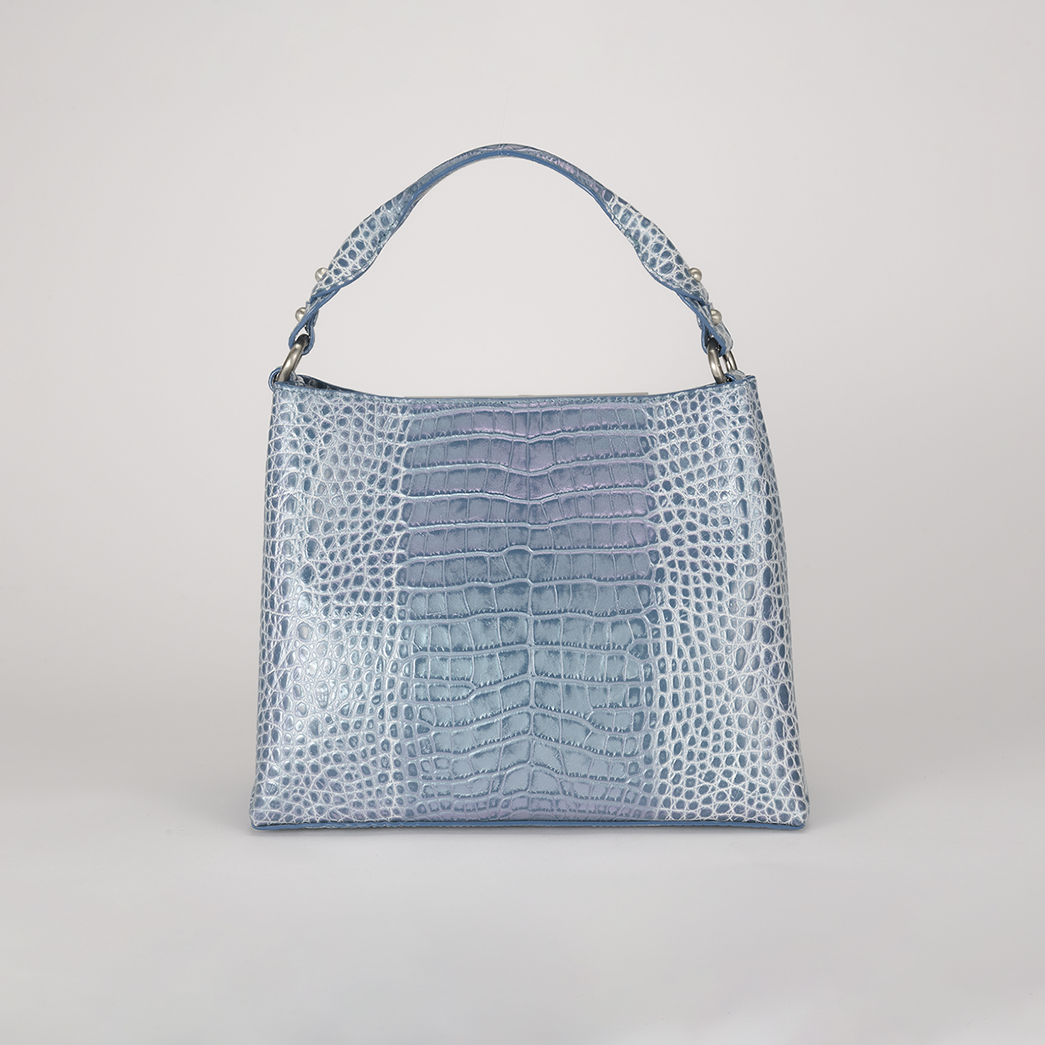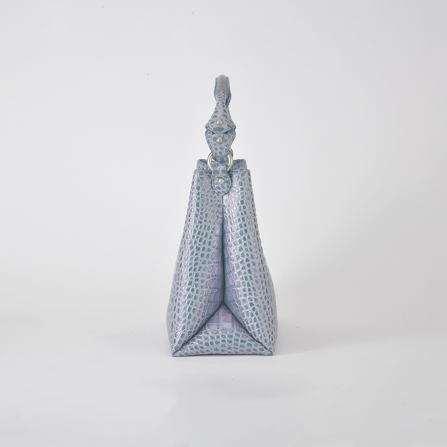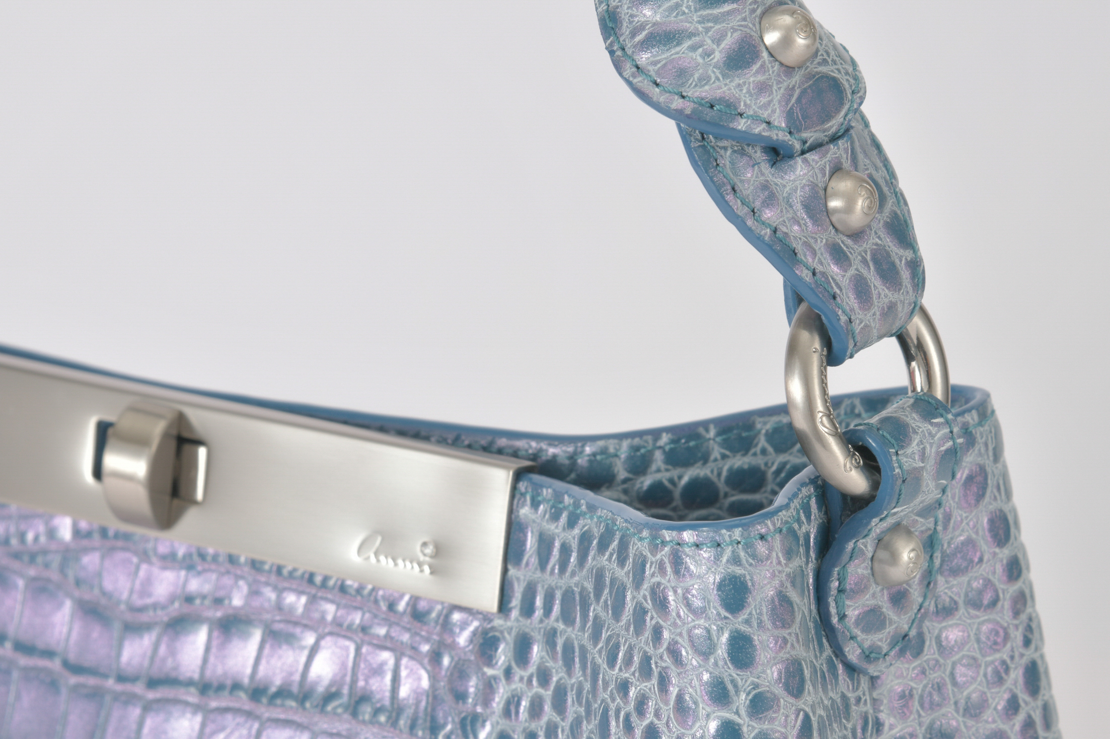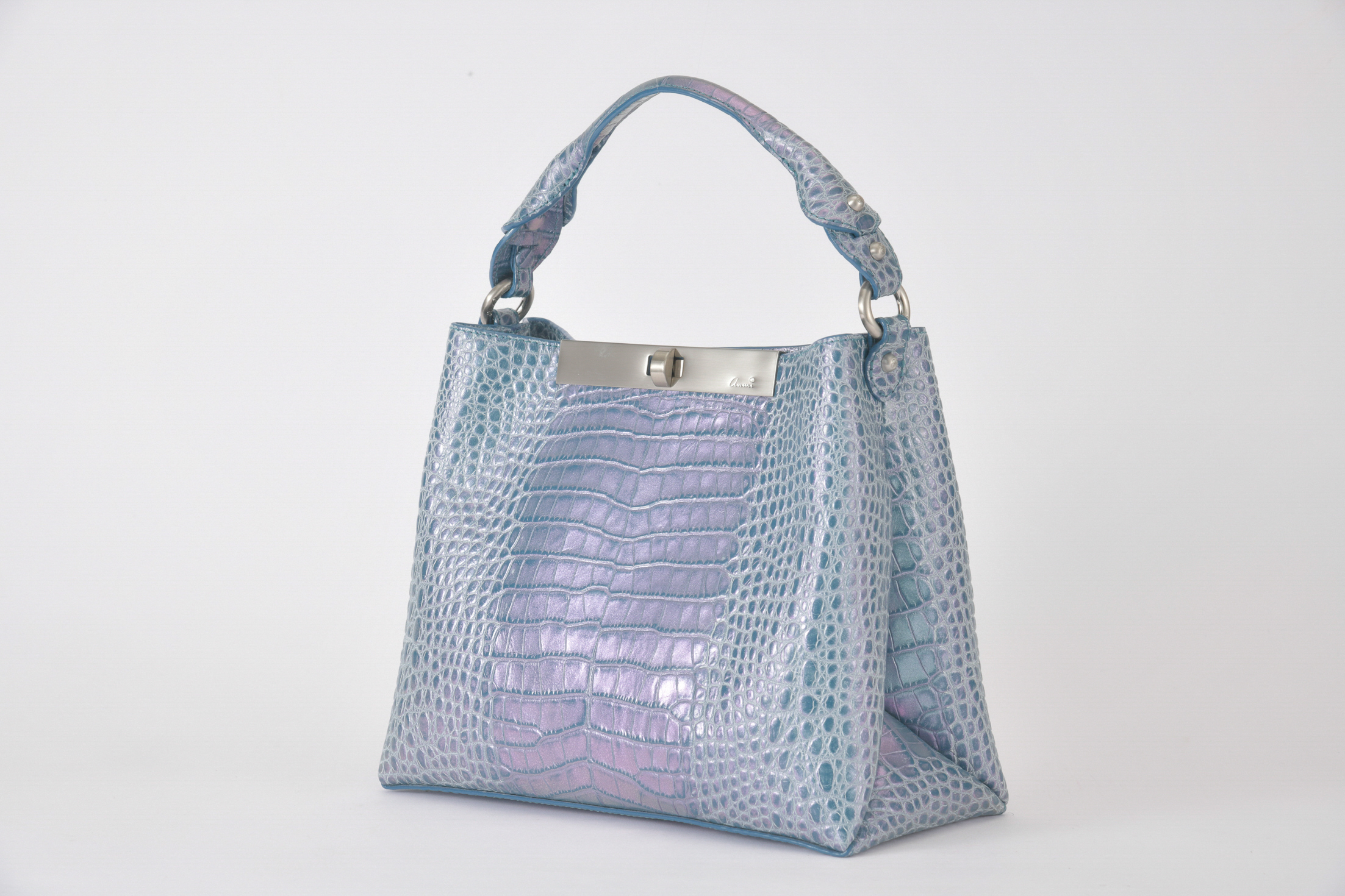素材はデザイナー独自にイタリア、ミラノ老舗革メーカーと開発したパールソフトクロコ型押し6色を展開。イタリアの熟練された職人しかできない手仕事でReal Pearl(本真珠)を砕き、散りばめ、なめし、さらに手触りの感度をオリジナルに調整することで繊細な柔らかさと軽さ、そして優しい艶、発色を実現したanmi特注イタリアンレザー。特に日本の女性に肌なじみ良く綺麗に見えるよう考案されています。