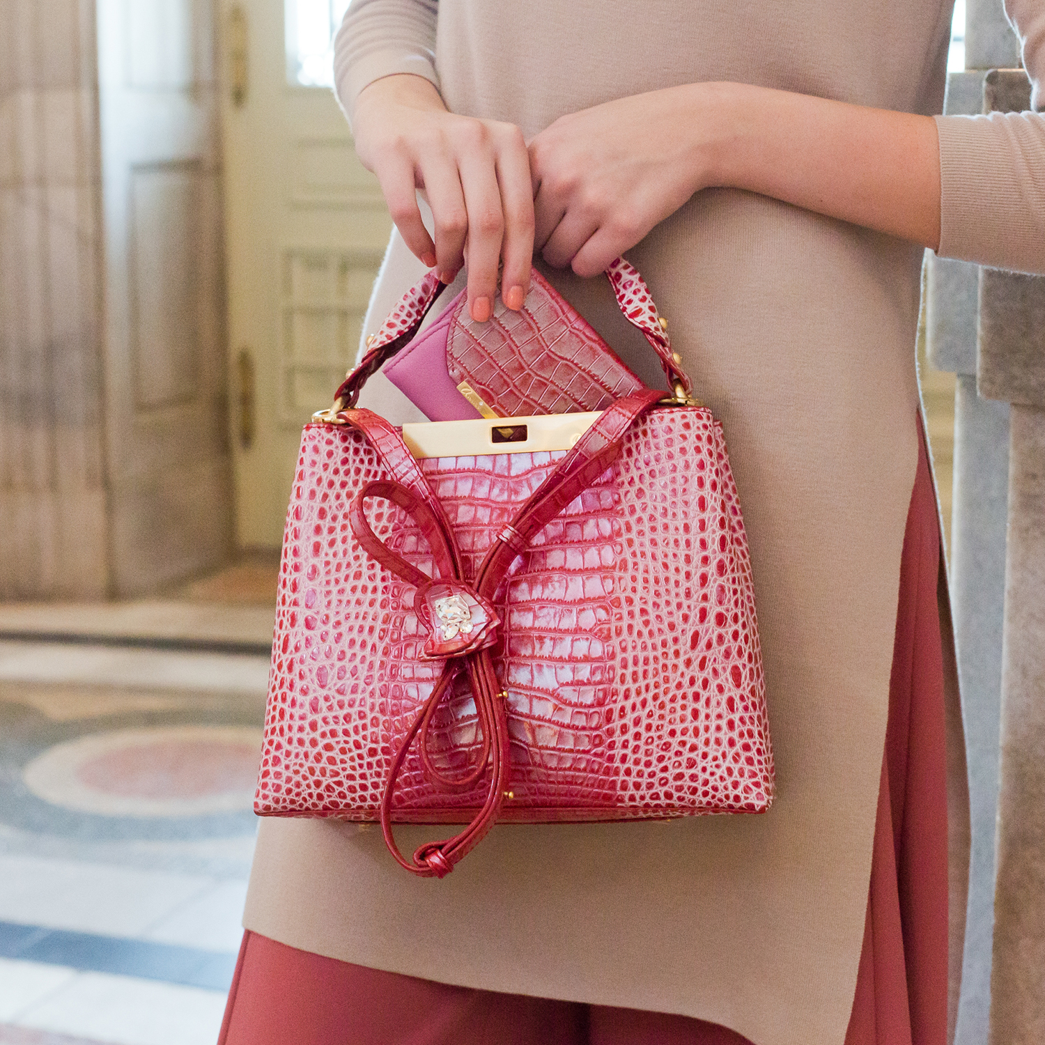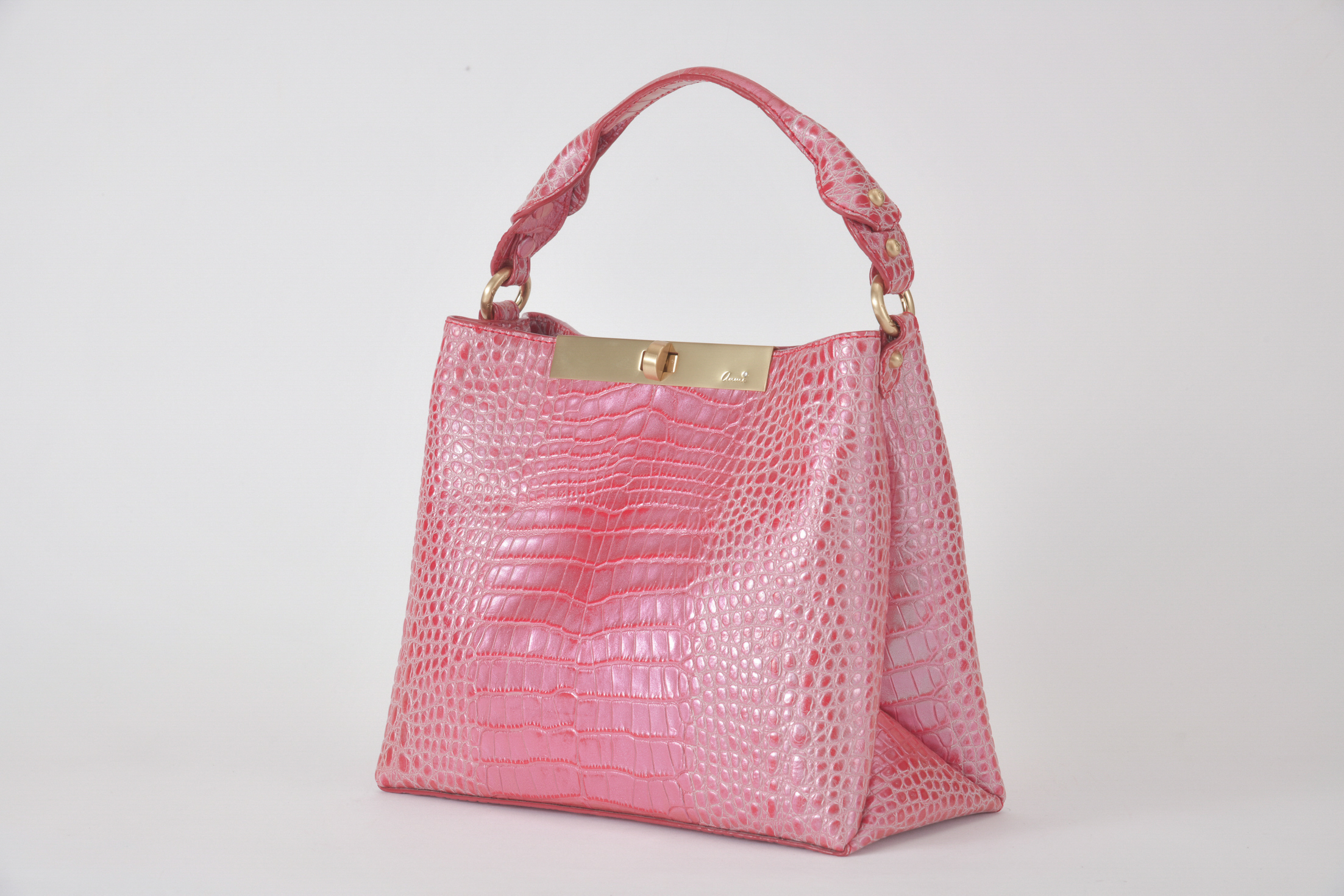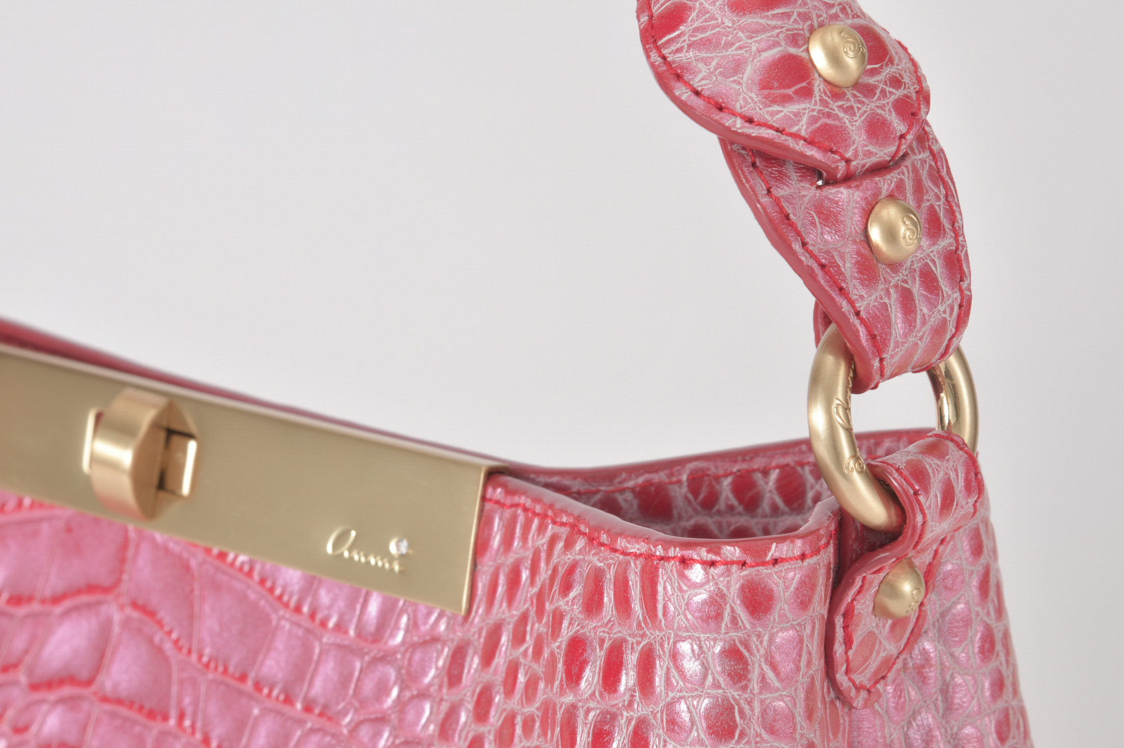 素材はデザイナー独自にイタリア、ミラノ老舗革メーカーと開発したパールソフトクロコ型押し6色を展開。イタリアの熟練された職人しかできない手仕事でReal Pearl(本真珠)を砕き、散りばめ、なめし、さらに手触りの感度をオリジナルに調整することで繊細な柔らかさと軽さ、そして優しい艶、発色を実現したanmi特注イタリアンレザー。特に日本の女性に肌なじみ良く綺麗に見えるよう考案されています。